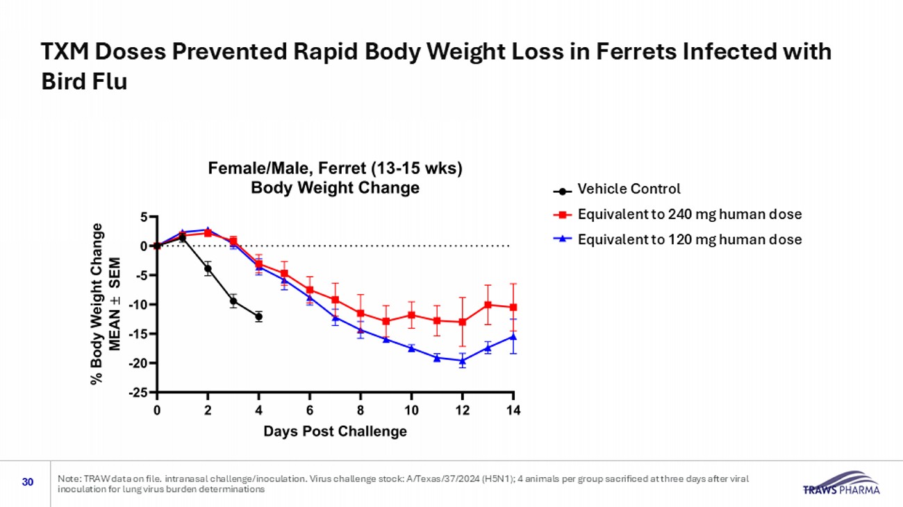 Vehicle Control Equivalent to 240 mg human dose Equivalent to 120 mg human dose TXM Dose - dependently Increased Survival in Ferrets Infected with Bird Flu 29 Note: TRAW data on file. intranasal challenge/inoculation. Virus challenge stock: A/Texas/37/2024 (H5N1); 4 animals per group sa crificed at three days after viral inoculation for lung virus burden determinations