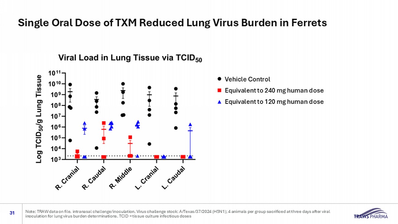 Vehicle Control High dose (equivalent to 240 mg human dose Low dose (equivalent to 120 mg human dose) Vehicle Control Equivalent to 240 mg human dose Equivalent to 120 mg human dose TXM Doses Prevented Rapid Body Weight Loss in Ferrets Infected with Bird Flu 30 Note: TRAW data on file. intranasal challenge/inoculation. Virus challenge stock: A/Texas/37/2024 (H5N1); 4 animals per group sa crificed at three days after viral inoculation for lung virus burden determinations