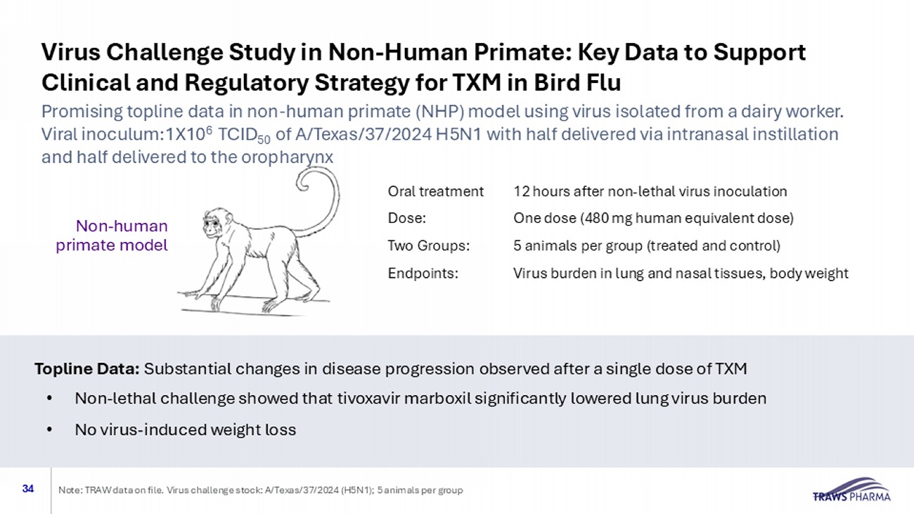 TXM Treatment Reduced Lung Pathology in Ferrets Infected with Bird Flu Virus: Dose - Dependent Impact on Cellular Infiltration of the Lungs 33 Note: TRAW data on file. intranasal infection with A/Texas/37/2024 (H5N1); lung pathology assessed three days after infectio n. Note: 1 = TXM dose of 10.6 mg; 2 = TSM dose of 21.2 mg. HE = human equivalent Day 3: Control Day 3 2 : Human Equivalent 240 mg Day 3 1 : Human Equivalent 120 mg Cellular infiltration/inflammation: basophilic, dark - staining areas (solid arrows ) • Control : Extensive cellular infiltration of lung • TXM 10.6 mg (HE120 mg): Areas of cellular infiltration greater than the 21.2 mg dose animals, far less than untreated controls • TXM 21.2 mg (HE 240 mg): Few areas of cellular infiltration, lung mostly normal with open alveoli