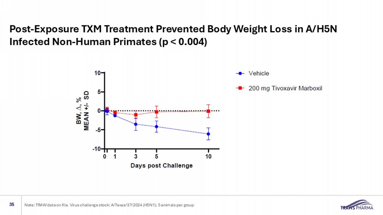Post - Exposure TXM Treatment Prevented Body Weight Loss in A/H5N1 - Infected Non - Human Primates (p < 0.004) 35 Note: TRAW data on file. Virus challenge stock: A/Texas/37/2024 (H5N1); 5 animals per group