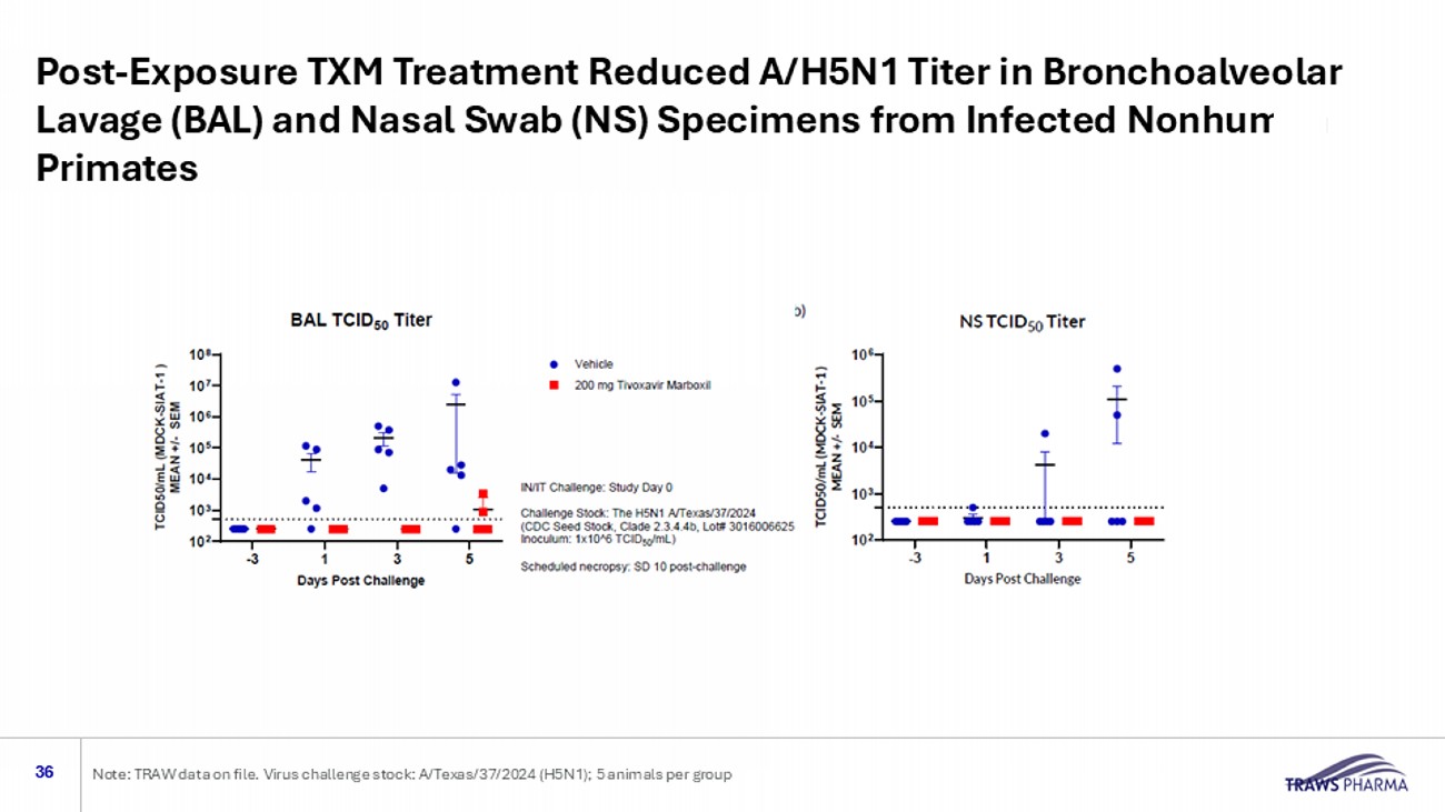Post - Exposure TXM Treatment Reduced A/H5N1 Titer in Bronchoalveolar Lavage (BAL) and Nasal Swab (NS) Specimens from Infected Nonhuman Primates 36 Note: TRAW data on file. Virus challenge stock: A/Texas/37/2024 (H5N1); 5 animals per group