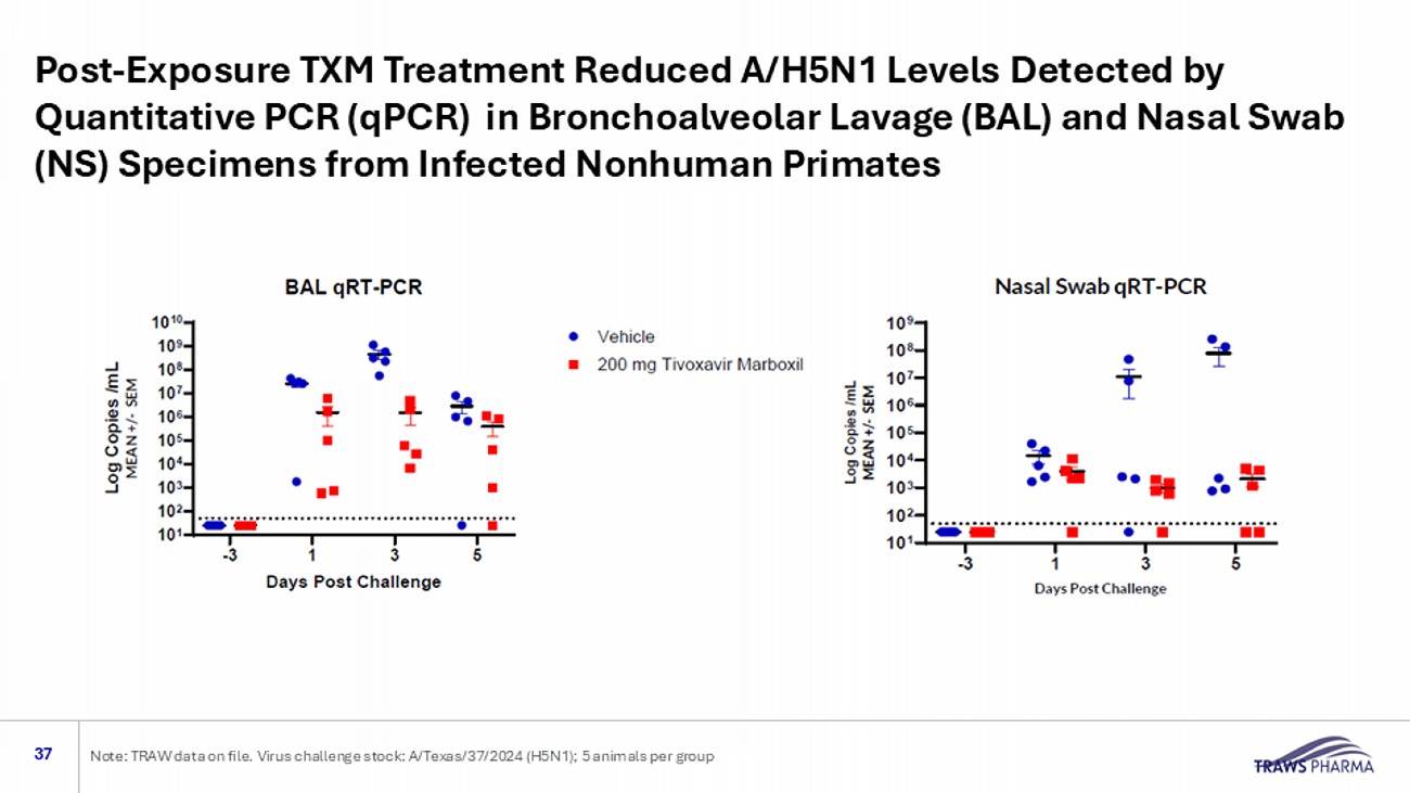 Post - Exposure TXM Treatment Reduced A/H5N1 Levels Detected by Quantitative PCR (qPCR) in Bronchoalveolar Lavage (BAL) and Nasal Swab (NS) Specimens from Infected Nonhuman Primates 37 Note: TRAW data on file. Virus challenge stock: A/Texas/37/2024 (H5N1); 5 animals per group
