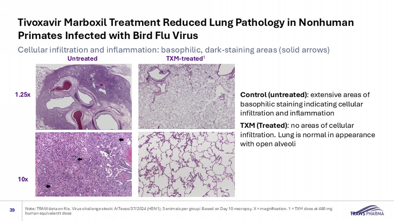 Tivoxavir Marboxil Treatment Reduced Lung Pathology in Nonhuman Primates Infected with Bird Flu Virus 39 Note: TRAW data on file. Virus challenge stock: A/Texas/37/2024 (H5N1); 5 animals per group: Based on Day 10 necropsy. X = ma gni fication. 1 = TXM dose at 480 mg human equivalent t dose Cellular infiltration and inflammation: basophilic, dark - staining areas (solid arrows) Untreated TXM - treated 1 Control (untreated) : extensive areas of basophilic staining indicating cellular infiltration and inflammation TXM (Treated) : no areas of cellular infiltration. Lung is normal in appearance with open alveoli 1.25x 10x