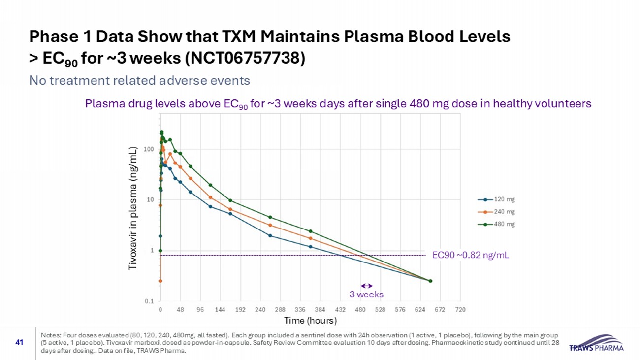 Phase 1 Study Design for TXM 40 Notes: TRAW data on file. Sentinels observed for 24 hours before dosing Main Group. Tivoxavir marboxil dose given as powder - in - capsule. Safety Review Committee evaluation 10 days after dosing. Pharmacokinetic study continued until 28 days after dosing. Eligibility : Healthy volunteers Flu - negative men and women, ages 18 - 64 years of age Endpoints: Primary: • Safety and tolerability Secondary: • Ability to maintain plasma blood levels above the EC 90 • Pharmacokinetics Treatment 80 mg,120 mg, 240 mg, 480 mg doses • 8 patients/dose (6 active, 2 placebo) per cohort • All cohorts were fasted and included an initial 2 - patient sentinel safety dose (1 active, 1 placebo) Single - dose regimen Assessments • Plasma drug level assessment multiple times over three weeks