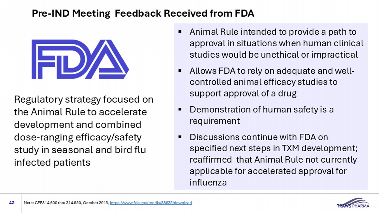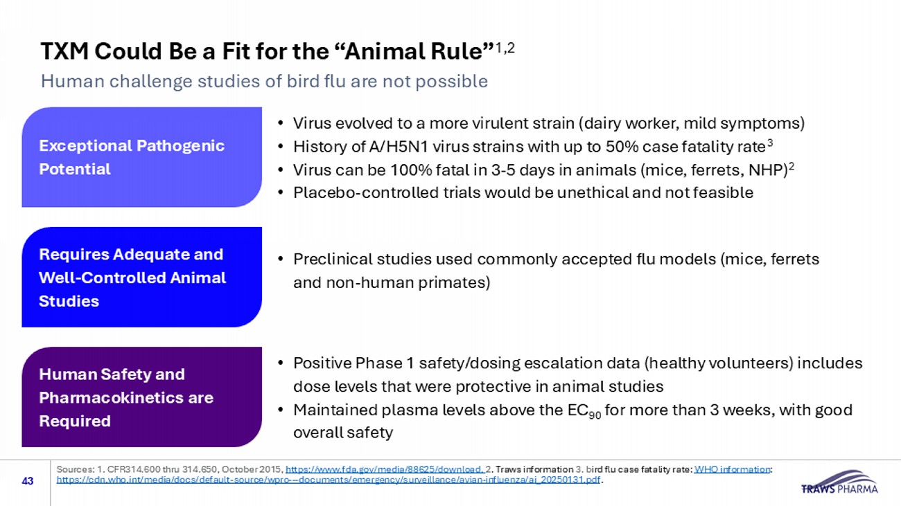 Pre - IND Meeting Feedback Received from FDA 42 Note: CFR314.600 thru 314.650 , October 2015 , https://www.fda.gov/media/88625/download Regulatory strategy focused on the Animal Rule to accelerate development and combined dose - ranging efficacy/safety study in seasonal and bird flu infected patients ▪ Animal Rule intended to provide a path to approval in situations when human clinical studies would be unethical or impractical ▪ Allows FDA to rely on adequate and well - controlled animal efficacy studies to support approval of a drug ▪ Demonstration of human safety is a requirement ▪ Discussions continue with FDA on specified next steps in TXM development; reaffirmed that Animal Rule not currently applicable for accelerated approval for influenza