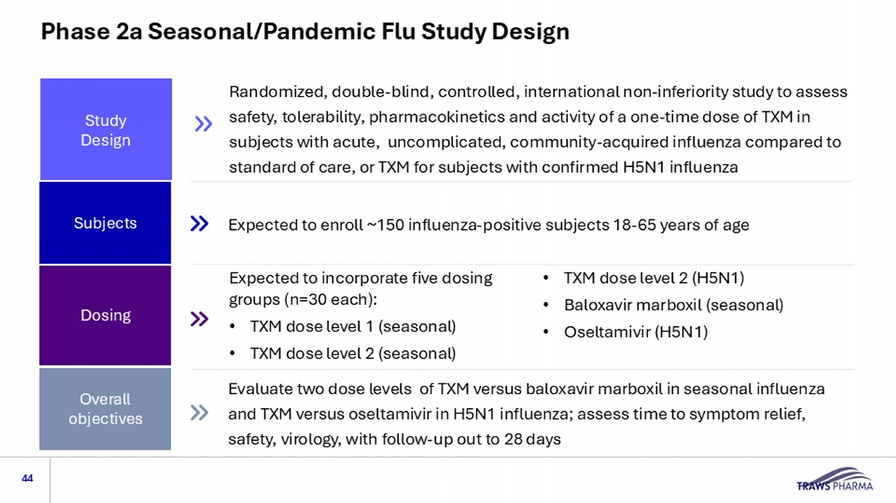Sources: 1. CFR314.600 thru 314.650 , October 2015 , https://www.fda.gov/media/88625/download. 2 . Traws information 3. b ird flu case fatality rate: WHO information : https://cdn.who.int/media/docs/default - source/wpro --- documents/emergency/surveillance/avian - influenza/ai_20250131.pdf . TXM Could Be a Fit for the “Animal Rule” 1,2 Human challenge studies of bird flu are not possible • Virus evolved to a more virulent strain (dairy worker, mild symptoms) • History of A/H5N1 virus strains with up to 50% case fatality rate 3 • Virus can be 100% fatal in 3 - 5 days in animals (mice, ferrets, NHP) 2 • Placebo - controlled trials would be unethical and not feasible • Preclinical studies used commonly accepted flu models (mice, ferrets and non - human primates) • Positive Phase 1 safety/dosing escalation data (healthy volunteers) includes dose levels that were protective in animal studies • Maintained plasma levels above the EC 90 for more than 3 weeks, with good overall safety Requires Adequate and Well - Controlled Animal Studies Exceptional Pathogenic Potential Human Safety and Pharmacokinetics are Required 43