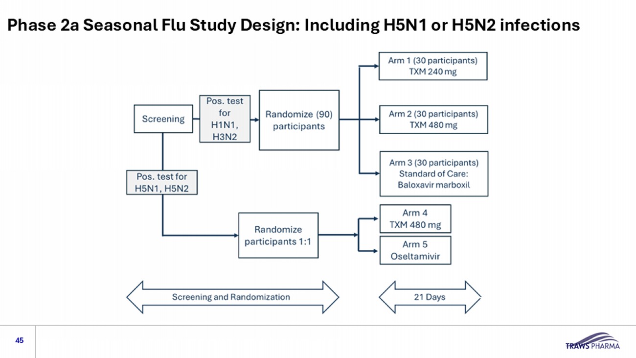 Phase 2a Seasonal/Pandemic Flu Study Design 44 Expected to enroll ~150 influenza - positive subjects 18 - 65 years of age Expected to incorporate five dosing groups (n=30 each): • TXM dose level 1 (seasonal) • TXM dose level 2 (seasonal) • TXM dose level 2 (H5N1) • Baloxavir marboxil (seasonal) • Oseltamivir (H5N1) Evaluate two dose levels of TXM versus baloxavir marboxil in seasonal influenza and TXM versus oseltamivir in H5N1 influenza; assess time to symptom relief, safety, virology, with follow - up out to 28 days Randomized, double - blind, controlled, international non - inferiority study to assess safety, tolerability, pharmacokinetics and activity of a one - time dose of TXM in subjects with acute, uncomplicated, community - acquired influenza compared to standard of care, or TXM for subjects with confirmed H5N1 influenza Study Design Subjects Overall objectives Dosing