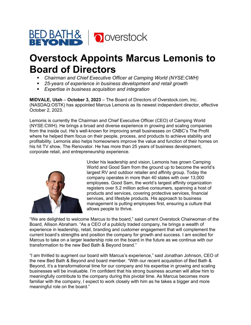 Overstock Appoints Marcus Lemonis to Board of Directors  Chairman and Chief Executive Officer at Camping World (NYSE:CWH)  25-years of experience in business development and retail growth  Expertise in business acquisition and integration MIDVALE, Utah – October 3, 2023 – The Board of Directors of Overstock.com, Inc. (NASDAQ:OSTK) has appointed Marcus Lemonis as its newest independent director, effective October 2, 2023. Lemonis is currently the Chairman and Chief Executive Officer (CEO) of Camping World (NYSE:CWH). He brings a broad and diverse experience in growing and scaling companies from the inside out. He’s well-known for improving small businesses on CNBC’s The Profit where he helped them focus on their people, process, and products to achieve stability and profitability. Lemonis also helps homeowners improve the value and function of their homes on his hit TV show, The Renovator. He has more than 25 years of business development, corporate retail, and entrepreneurship experience. Under his leadership and vision, Lemonis has grown Camping World and Good Sam from the ground up to become the world’s largest RV and outdoor retailer and affinity group. Today the company operates in more than 40 states with over 13,000 employees. Good Sam, the world’s largest affinity organization registers over 5.2 million active consumers, spanning a host of products and services, covering protective services, financial services, and lifestyle products. His approach to business management is putting employees first, ensuring a culture that allows people to thrive. “We are delighted to welcome Marcus to the board,” said current Overstock Chairwoman of the Board, Allison Abraham. “As a CEO of a publicly traded company, he brings a wealth of experience in leadership, retail, branding and customer engagement that will complement the current board’s strengths and position the company for growth and success. I am excited for Marcus to take on a larger leadership role on the board in the future as we continue with our transformation to the new Bed Bath & Beyond brand.” “I am thrilled to augment our board with Marcus’s experience,” said Jonathan Johnson, CEO of the new Bed Bath & Beyond and board member. “With our recent acquisition of Bed Bath & Beyond, it’s a transformational time for our company and his expertise in growing and scaling businesses will be invaluable. I’m confident that his strong business acumen will allow him to meaningfully contribute to the company during this pivotal time. As Marcus becomes more familiar with the company, I expect to work closely with him as he takes a bigger and more meaningful role on the board.”