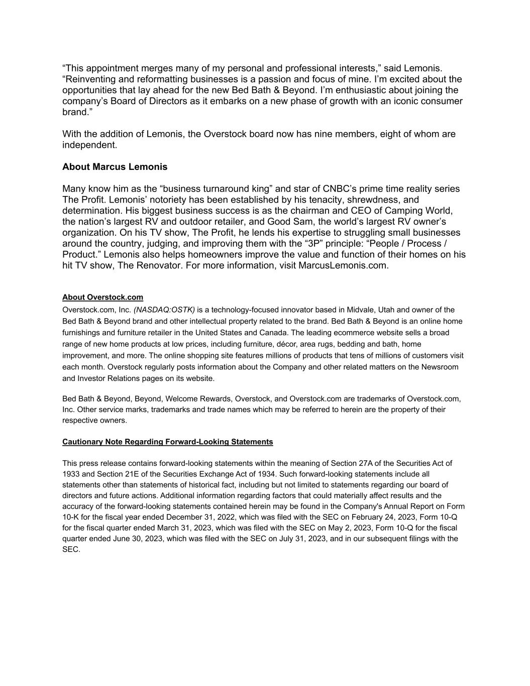 “This appointment merges many of my personal and professional interests,” said Lemonis. “Reinventing and reformatting businesses is a passion and focus of mine. I’m excited about the opportunities that lay ahead for the new Bed Bath & Beyond. I’m enthusiastic about joining the company’s Board of Directors as it embarks on a new phase of growth with an iconic consumer brand.” With the addition of Lemonis, the Overstock board now has nine members, eight of whom are independent. About Marcus Lemonis Many know him as the “business turnaround king” and star of CNBC’s prime time reality series The Profit. Lemonis’ notoriety has been established by his tenacity, shrewdness, and determination. His biggest business success is as the chairman and CEO of Camping World, the nation’s largest RV and outdoor retailer, and Good Sam, the world’s largest RV owner’s organization. On his TV show, The Profit, he lends his expertise to struggling small businesses around the country, judging, and improving them with the “3P” principle: “People / Process / Product.” Lemonis also helps homeowners improve the value and function of their homes on his hit TV show, The Renovator. For more information, visit MarcusLemonis.com. About Overstock.com Overstock.com, Inc. (NASDAQ:OSTK) is a technology-focused innovator based in Midvale, Utah and owner of the Bed Bath & Beyond brand and other intellectual property related to the brand. Bed Bath & Beyond is an online home furnishings and furniture retailer in the United States and Canada. The leading ecommerce website sells a broad range of new home products at low prices, including furniture, décor, area rugs, bedding and bath, home improvement, and more. The online shopping site features millions of products that tens of millions of customers visit each month. Overstock regularly posts information about the Company and other related matters on the Newsroom and Investor Relations pages on its website. Bed Bath & Beyond, Beyond, Welcome Rewards, Overstock, and Overstock.com are trademarks of Overstock.com, Inc. Other service marks, trademarks and trade names which may be referred to herein are the property of their respective owners. Cautionary Note Regarding Forward-Looking Statements This press release contains forward-looking statements within the meaning of Section 27A of the Securities Act of 1933 and Section 21E of the Securities Exchange Act of 1934. Such forward-looking statements include all statements other than statements of historical fact, including but not limited to statements regarding our board of directors and future actions. Additional information regarding factors that could materially affect results and the accuracy of the forward-looking statements contained herein may be found in the Company's Annual Report on Form 10-K for the fiscal year ended December 31, 2022, which was filed with the SEC on February 24, 2023, Form 10-Q for the fiscal quarter ended March 31, 2023, which was filed with the SEC on May 2, 2023, Form 10-Q for the fiscal quarter ended June 30, 2023, which was filed with the SEC on July 31, 2023, and in our subsequent filings with the SEC.