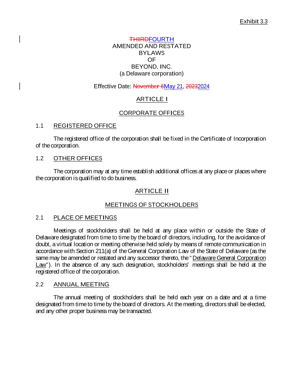 Exhibit 3.3 THIRDFOURTH AMENDED AND RESTATED BYLAWS OF BEYOND, INC. (a Delaware corporation) Effective Date: November 6May 21, 20232024 ARTICLE I CORPORATE OFFICES 1.1 REGISTERED OFFICE The registered office of the corporation shall be fixed in the Certificate of Incorporation of the corporation. 1.2 OTHER OFFICES The corporation may at any time establish additional offices at any place or places where the corporation is qualified to do business. ARTICLE II MEETINGS OF STOCKHOLDERS 2.1 PLACE OF MEETINGS Meetings of stockholders shall be held at any place within or outside the State of Delaware designated from time to time by the board of directors, including, for the avoidance of doubt, a virtual location or meeting otherwise held solely by means of remote communication in accordance with Section 211(a) of the General Corporation Law of the State of Delaware (as the same may be amended or restated and any successor thereto, the “Delaware General Corporation Law”). In the absence of any such designation, stockholders’ meetings shall be held at the registered office of the corporation. 2.2 ANNUAL MEETING The annual meeting of stockholders shall be held each year on a date and at a time designated from time to time by the board of directors. At the meeting, directors shall be elected, and any other proper business may be transacted.