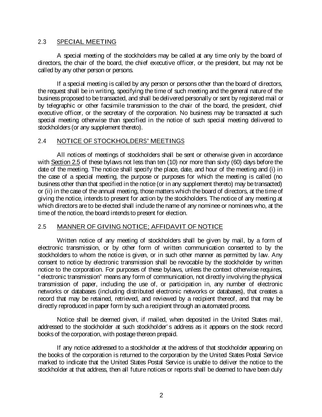 2.3 SPECIAL MEETING A special meeting of the stockholders may be called at any time only by the board of directors, the chair of the board, the chief executive officer, or the president, but may not be called by any other person or persons. If a special meeting is called by any person or persons other than the board of directors, the request shall be in writing, specifying the time of such meeting and the general nature of the business proposed to be transacted, and shall be delivered personally or sent by registered mail or by telegraphic or other facsimile transmission to the chair of the board, the president, chief executive officer, or the secretary of the corporation. No business may be transacted at such special meeting otherwise than specified in the notice of such special meeting delivered to stockholders (or any supplement thereto). 2.4 NOTICE OF STOCKHOLDERS’ MEETINGS All notices of meetings of stockholders shall be sent or otherwise given in accordance with Section 2.5 of these bylaws not less than ten (10) nor more than sixty (60) days before the date of the meeting. The notice shall specify the place, date, and hour of the meeting and (i) in the case of a special meeting, the purpose or purposes for which the meeting is called (no business other than that specified in the notice (or in any supplement thereto) may be transacted) or (ii) in the case of the annual meeting, those matters which the board of directors, at the time of giving the notice, intends to present for action by the stockholders. The notice of any meeting at which directors are to be elected shall include the name of any nominee or nominees who, at the time of the notice, the board intends to present for election. 2.5 MANNER OF GIVING NOTICE; AFFIDAVIT OF NOTICE Written notice of any meeting of stockholders shall be given by mail, by a form of electronic transmission, or by other form of written communication consented to by the stockholders to whom the notice is given, or in such other manner as permitted by law. Any consent to notice by electronic transmission shall be revocable by the stockholder by written notice to the corporation. For purposes of these bylaws, unless the context otherwise requires, “electronic transmission” means any form of communication, not directly involving the physical transmission of paper, including the use of, or participation in, any number of electronic networks or databases (including distributed electronic networks or databases), that creates a record that may be retained, retrieved, and reviewed by a recipient thereof, and that may be directly reproduced in paper form by such a recipient through an automated process. Notice shall be deemed given, if mailed, when deposited in the United States mail, addressed to the stockholder at such stockholder’s address as it appears on the stock record books of the corporation, with postage thereon prepaid. If any notice addressed to a stockholder at the address of that stockholder appearing on the books of the corporation is returned to the corporation by the United States Postal Service marked to indicate that the United States Postal Service is unable to deliver the notice to the stockholder at that address, then all future notices or reports shall be deemed to have been duly 2
