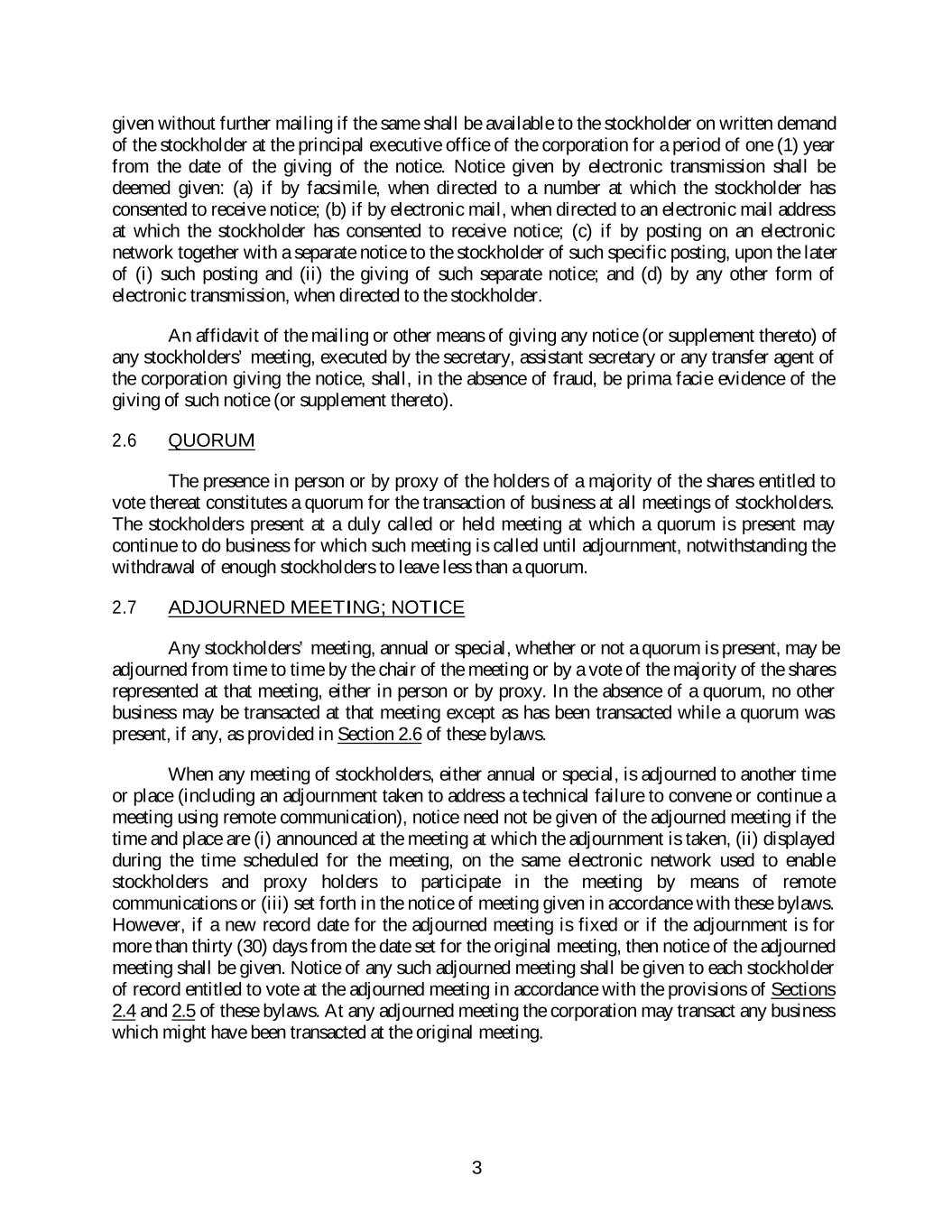 given without further mailing if the same shall be available to the stockholder on written demand of the stockholder at the principal executive office of the corporation for a period of one (1) year from the date of the giving of the notice. Notice given by electronic transmission shall be deemed given: (a) if by facsimile, when directed to a number at which the stockholder has consented to receive notice; (b) if by electronic mail, when directed to an electronic mail address at which the stockholder has consented to receive notice; (c) if by posting on an electronic network together with a separate notice to the stockholder of such specific posting, upon the later of (i) such posting and (ii) the giving of such separate notice; and (d) by any other form of electronic transmission, when directed to the stockholder. An affidavit of the mailing or other means of giving any notice (or supplement thereto) of any stockholders’ meeting, executed by the secretary, assistant secretary or any transfer agent of the corporation giving the notice, shall, in the absence of fraud, be prima facie evidence of the giving of such notice (or supplement thereto). 2.6 QUORUM The presence in person or by proxy of the holders of a majority of the shares entitled to vote thereat constitutes a quorum for the transaction of business at all meetings of stockholders. The stockholders present at a duly called or held meeting at which a quorum is present may continue to do business for which such meeting is called until adjournment, notwithstanding the withdrawal of enough stockholders to leave less than a quorum. 2.7 ADJOURNED MEETING; NOTICE Any stockholders’ meeting, annual or special, whether or not a quorum is present, may be adjourned from time to time by the chair of the meeting or by a vote of the majority of the shares represented at that meeting, either in person or by proxy. In the absence of a quorum, no other business may be transacted at that meeting except as has been transacted while a quorum was present, if any, as provided in Section 2.6 of these bylaws. When any meeting of stockholders, either annual or special, is adjourned to another time or place (including an adjournment taken to address a technical failure to convene or continue a meeting using remote communication), notice need not be given of the adjourned meeting if the time and place are (i) announced at the meeting at which the adjournment is taken, (ii) displayed during the time scheduled for the meeting, on the same electronic network used to enable stockholders and proxy holders to participate in the meeting by means of remote communications or (iii) set forth in the notice of meeting given in accordance with these bylaws. However, if a new record date for the adjourned meeting is fixed or if the adjournment is for more than thirty (30) days from the date set for the original meeting, then notice of the adjourned meeting shall be given. Notice of any such adjourned meeting shall be given to each stockholder of record entitled to vote at the adjourned meeting in accordance with the provisions of Sections 2.4 and 2.5 of these bylaws. At any adjourned meeting the corporation may transact any business which might have been transacted at the original meeting. 3
