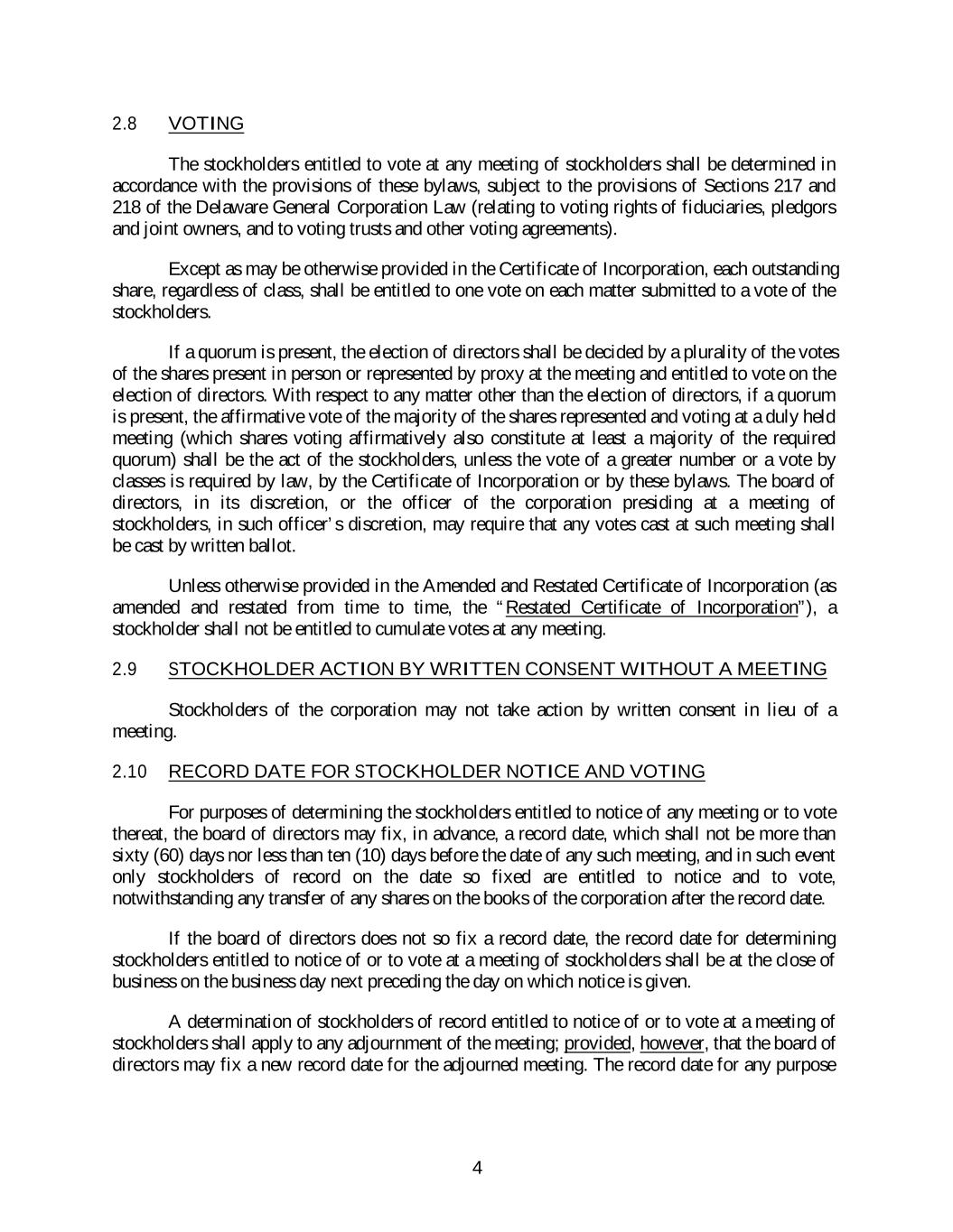 2.8 VOTING The stockholders entitled to vote at any meeting of stockholders shall be determined in accordance with the provisions of these bylaws, subject to the provisions of Sections 217 and 218 of the Delaware General Corporation Law (relating to voting rights of fiduciaries, pledgors and joint owners, and to voting trusts and other voting agreements). Except as may be otherwise provided in the Certificate of Incorporation, each outstanding share, regardless of class, shall be entitled to one vote on each matter submitted to a vote of the stockholders. If a quorum is present, the election of directors shall be decided by a plurality of the votes of the shares present in person or represented by proxy at the meeting and entitled to vote on the election of directors. With respect to any matter other than the election of directors, if a quorum is present, the affirmative vote of the majority of the shares represented and voting at a duly held meeting (which shares voting affirmatively also constitute at least a majority of the required quorum) shall be the act of the stockholders, unless the vote of a greater number or a vote by classes is required by law, by the Certificate of Incorporation or by these bylaws. The board of directors, in its discretion, or the officer of the corporation presiding at a meeting of stockholders, in such officer’s discretion, may require that any votes cast at such meeting shall be cast by written ballot. Unless otherwise provided in the Amended and Restated Certificate of Incorporation (as amended and restated from time to time, the “Restated Certificate of Incorporation”), a stockholder shall not be entitled to cumulate votes at any meeting. 2.9 STOCKHOLDER ACTION BY WRITTEN CONSENT WITHOUT A MEETING Stockholders of the corporation may not take action by written consent in lieu of a meeting. 2.10 RECORD DATE FOR STOCKHOLDER NOTICE AND VOTING For purposes of determining the stockholders entitled to notice of any meeting or to vote thereat, the board of directors may fix, in advance, a record date, which shall not be more than sixty (60) days nor less than ten (10) days before the date of any such meeting, and in such event only stockholders of record on the date so fixed are entitled to notice and to vote, notwithstanding any transfer of any shares on the books of the corporation after the record date. If the board of directors does not so fix a record date, the record date for determining stockholders entitled to notice of or to vote at a meeting of stockholders shall be at the close of business on the business day next preceding the day on which notice is given. A determination of stockholders of record entitled to notice of or to vote at a meeting of stockholders shall apply to any adjournment of the meeting; provided, however, that the board of directors may fix a new record date for the adjourned meeting. The record date for any purpose 4