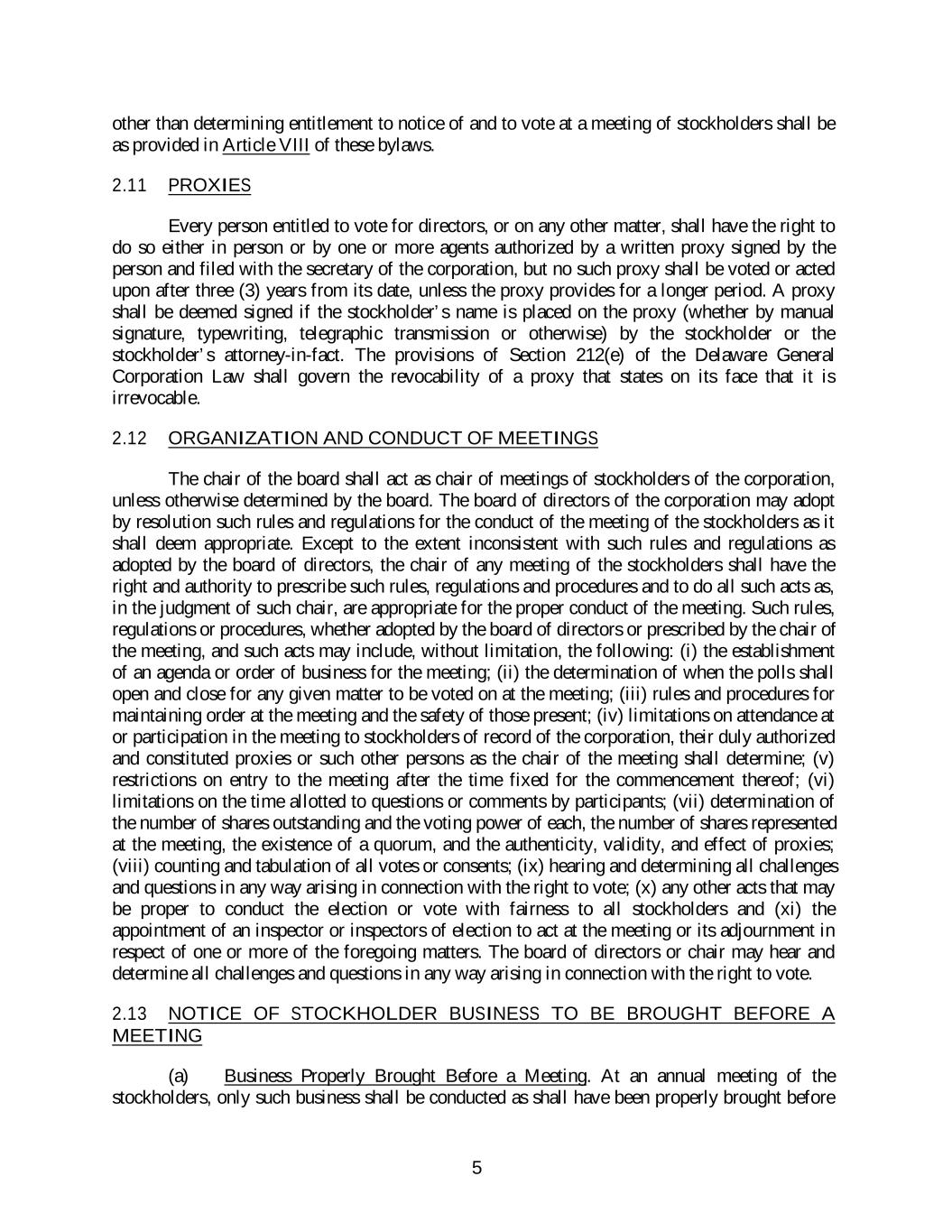 other than determining entitlement to notice of and to vote at a meeting of stockholders shall be as provided in Article VIII of these bylaws. 2.11 PROXIES Every person entitled to vote for directors, or on any other matter, shall have the right to do so either in person or by one or more agents authorized by a written proxy signed by the person and filed with the secretary of the corporation, but no such proxy shall be voted or acted upon after three (3) years from its date, unless the proxy provides for a longer period. A proxy shall be deemed signed if the stockholder’s name is placed on the proxy (whether by manual signature, typewriting, telegraphic transmission or otherwise) by the stockholder or the stockholder’s attorney-in-fact. The provisions of Section 212(e) of the Delaware General Corporation Law shall govern the revocability of a proxy that states on its face that it is irrevocable. 2.12 ORGANIZATION AND CONDUCT OF MEETINGS The chair of the board shall act as chair of meetings of stockholders of the corporation, unless otherwise determined by the board. The board of directors of the corporation may adopt by resolution such rules and regulations for the conduct of the meeting of the stockholders as it shall deem appropriate. Except to the extent inconsistent with such rules and regulations as adopted by the board of directors, the chair of any meeting of the stockholders shall have the right and authority to prescribe such rules, regulations and procedures and to do all such acts as, in the judgment of such chair, are appropriate for the proper conduct of the meeting. Such rules, regulations or procedures, whether adopted by the board of directors or prescribed by the chair of the meeting, and such acts may include, without limitation, the following: (i) the establishment of an agenda or order of business for the meeting; (ii) the determination of when the polls shall open and close for any given matter to be voted on at the meeting; (iii) rules and procedures for maintaining order at the meeting and the safety of those present; (iv) limitations on attendance at or participation in the meeting to stockholders of record of the corporation, their duly authorized and constituted proxies or such other persons as the chair of the meeting shall determine; (v) restrictions on entry to the meeting after the time fixed for the commencement thereof; (vi) limitations on the time allotted to questions or comments by participants; (vii) determination of the number of shares outstanding and the voting power of each, the number of shares represented at the meeting, the existence of a quorum, and the authenticity, validity, and effect of proxies; (viii) counting and tabulation of all votes or consents; (ix) hearing and determining all challenges and questions in any way arising in connection with the right to vote; (x) any other acts that may be proper to conduct the election or vote with fairness to all stockholders and (xi) the appointment of an inspector or inspectors of election to act at the meeting or its adjournment in respect of one or more of the foregoing matters. The board of directors or chair may hear and determine all challenges and questions in any way arising in connection with the right to vote. 2.13 NOTICE OF STOCKHOLDER BUSINESS TO BE BROUGHT BEFORE A MEETING (a) Business Properly Brought Before a Meeting. At an annual meeting of the stockholders, only such business shall be conducted as shall have been properly brought before 5