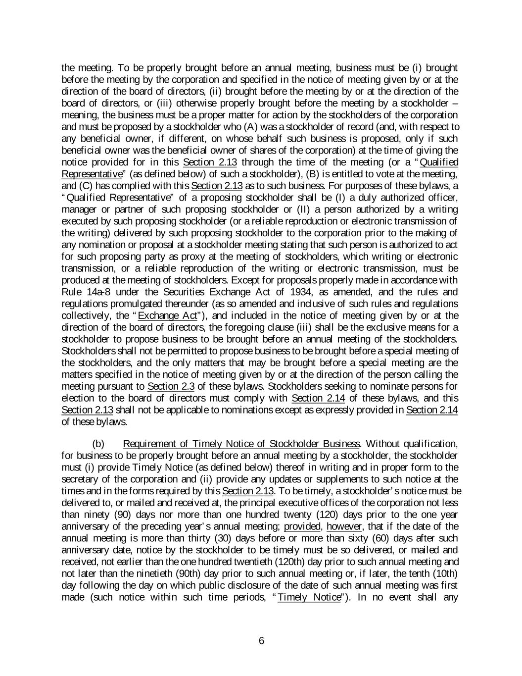 the meeting. To be properly brought before an annual meeting, business must be (i) brought before the meeting by the corporation and specified in the notice of meeting given by or at the direction of the board of directors, (ii) brought before the meeting by or at the direction of the board of directors, or (iii) otherwise properly brought before the meeting by a stockholder – meaning, the business must be a proper matter for action by the stockholders of the corporation and must be proposed by a stockholder who (A) was a stockholder of record (and, with respect to any beneficial owner, if different, on whose behalf such business is proposed, only if such beneficial owner was the beneficial owner of shares of the corporation) at the time of giving the notice provided for in this Section 2.13 through the time of the meeting (or a “Qualified Representative” (as defined below) of such a stockholder), (B) is entitled to vote at the meeting, and (C) has complied with this Section 2.13 as to such business. For purposes of these bylaws, a “Qualified Representative” of a proposing stockholder shall be (I) a duly authorized officer, manager or partner of such proposing stockholder or (II) a person authorized by a writing executed by such proposing stockholder (or a reliable reproduction or electronic transmission of the writing) delivered by such proposing stockholder to the corporation prior to the making of any nomination or proposal at a stockholder meeting stating that such person is authorized to act for such proposing party as proxy at the meeting of stockholders, which writing or electronic transmission, or a reliable reproduction of the writing or electronic transmission, must be produced at the meeting of stockholders. Except for proposals properly made in accordance with Rule 14a-8 under the Securities Exchange Act of 1934, as amended, and the rules and regulations promulgated thereunder (as so amended and inclusive of such rules and regulations collectively, the “Exchange Act”), and included in the notice of meeting given by or at the direction of the board of directors, the foregoing clause (iii) shall be the exclusive means for a stockholder to propose business to be brought before an annual meeting of the stockholders. Stockholders shall not be permitted to propose business to be brought before a special meeting of the stockholders, and the only matters that may be brought before a special meeting are the matters specified in the notice of meeting given by or at the direction of the person calling the meeting pursuant to Section 2.3 of these bylaws. Stockholders seeking to nominate persons for election to the board of directors must comply with Section 2.14 of these bylaws, and this Section 2.13 shall not be applicable to nominations except as expressly provided in Section 2.14 of these bylaws. (b) Requirement of Timely Notice of Stockholder Business. Without qualification, for business to be properly brought before an annual meeting by a stockholder, the stockholder must (i) provide Timely Notice (as defined below) thereof in writing and in proper form to the secretary of the corporation and (ii) provide any updates or supplements to such notice at the times and in the forms required by this Section 2.13. To be timely, a stockholder’s notice must be delivered to, or mailed and received at, the principal executive offices of the corporation not less than ninety (90) days nor more than one hundred twenty (120) days prior to the one year anniversary of the preceding year’s annual meeting; provided, however, that if the date of the annual meeting is more than thirty (30) days before or more than sixty (60) days after such anniversary date, notice by the stockholder to be timely must be so delivered, or mailed and received, not earlier than the one hundred twentieth (120th) day prior to such annual meeting and not later than the ninetieth (90th) day prior to such annual meeting or, if later, the tenth (10th) day following the day on which public disclosure of the date of such annual meeting was first made (such notice within such time periods, “Timely Notice”). In no event shall any 6