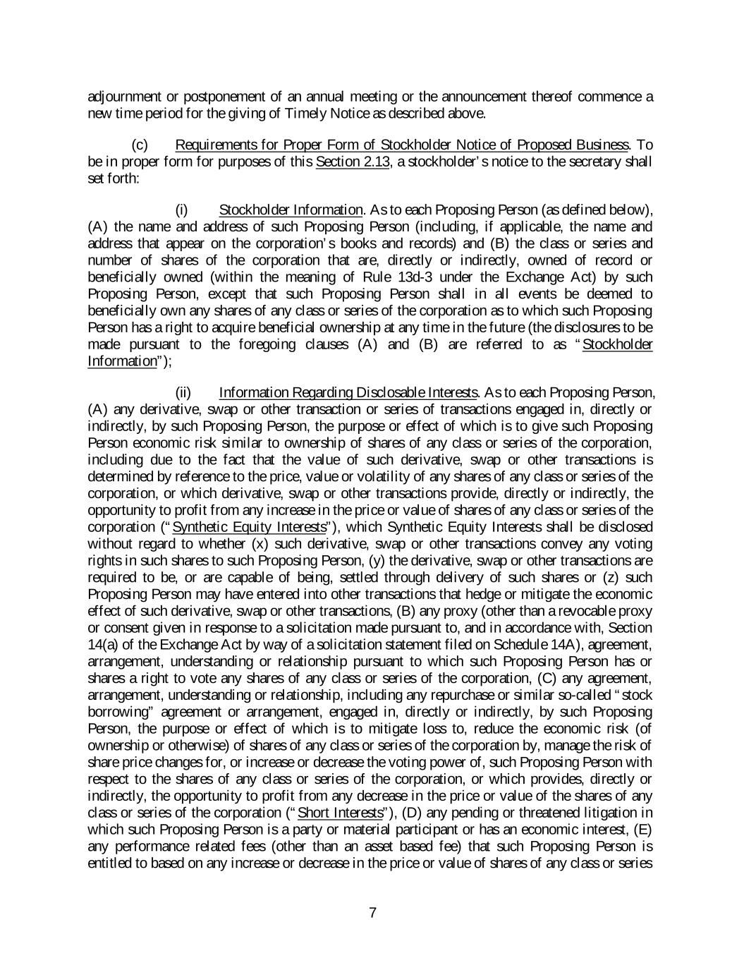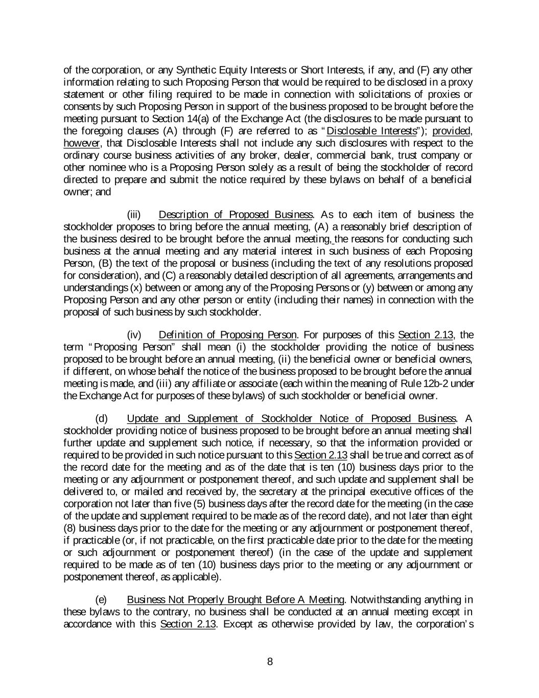 of the corporation, or any Synthetic Equity Interests or Short Interests, if any, and (F) any other information relating to such Proposing Person that would be required to be disclosed in a proxy statement or other filing required to be made in connection with solicitations of proxies or consents by such Proposing Person in support of the business proposed to be brought before the meeting pursuant to Section 14(a) of the Exchange Act (the disclosures to be made pursuant to the foregoing clauses (A) through (F) are referred to as “Disclosable Interests”); provided, however, that Disclosable Interests shall not include any such disclosures with respect to the ordinary course business activities of any broker, dealer, commercial bank, trust company or other nominee who is a Proposing Person solely as a result of being the stockholder of record directed to prepare and submit the notice required by these bylaws on behalf of a beneficial owner; and (iii) Description of Proposed Business. As to each item of business the stockholder proposes to bring before the annual meeting, (A) a reasonably brief description of the business desired to be brought before the annual meeting, the reasons for conducting such business at the annual meeting and any material interest in such business of each Proposing Person, (B) the text of the proposal or business (including the text of any resolutions proposed for consideration), and (C) a reasonably detailed description of all agreements, arrangements and understandings (x) between or among any of the Proposing Persons or (y) between or among any Proposing Person and any other person or entity (including their names) in connection with the proposal of such business by such stockholder. (iv) Definition of Proposing Person. For purposes of this Section 2.13, the term “Proposing Person” shall mean (i) the stockholder providing the notice of business proposed to be brought before an annual meeting, (ii) the beneficial owner or beneficial owners, if different, on whose behalf the notice of the business proposed to be brought before the annual meeting is made, and (iii) any affiliate or associate (each within the meaning of Rule 12b-2 under the Exchange Act for purposes of these bylaws) of such stockholder or beneficial owner. (d) Update and Supplement of Stockholder Notice of Proposed Business. A stockholder providing notice of business proposed to be brought before an annual meeting shall further update and supplement such notice, if necessary, so that the information provided or required to be provided in such notice pursuant to this Section 2.13 shall be true and correct as of the record date for the meeting and as of the date that is ten (10) business days prior to the meeting or any adjournment or postponement thereof, and such update and supplement shall be delivered to, or mailed and received by, the secretary at the principal executive offices of the corporation not later than five (5) business days after the record date for the meeting (in the case of the update and supplement required to be made as of the record date), and not later than eight (8) business days prior to the date for the meeting or any adjournment or postponement thereof, if practicable (or, if not practicable, on the first practicable date prior to the date for the meeting or such adjournment or postponement thereof) (in the case of the update and supplement required to be made as of ten (10) business days prior to the meeting or any adjournment or postponement thereof, as applicable). (e) Business Not Properly Brought Before A Meeting. Notwithstanding anything in these bylaws to the contrary, no business shall be conducted at an annual meeting except in accordance with this Section 2.13. Except as otherwise provided by law, the corporation’s 8