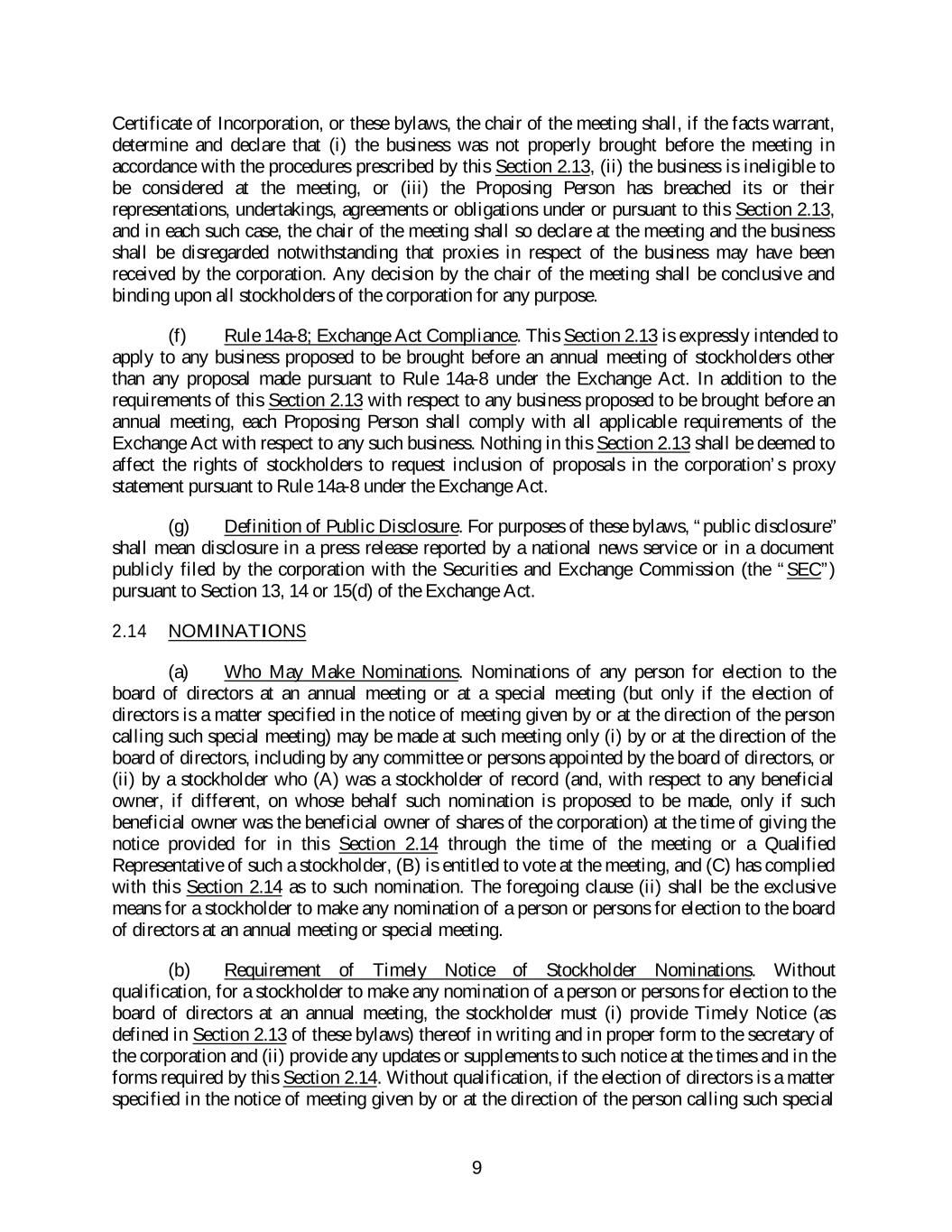 Certificate of Incorporation, or these bylaws, the chair of the meeting shall, if the facts warrant, determine and declare that (i) the business was not properly brought before the meeting in accordance with the procedures prescribed by this Section 2.13, (ii) the business is ineligible to be considered at the meeting, or (iii) the Proposing Person has breached its or their representations, undertakings, agreements or obligations under or pursuant to this Section 2.13, and in each such case, the chair of the meeting shall so declare at the meeting and the business shall be disregarded notwithstanding that proxies in respect of the business may have been received by the corporation. Any decision by the chair of the meeting shall be conclusive and binding upon all stockholders of the corporation for any purpose. (f) Rule 14a-8; Exchange Act Compliance. This Section 2.13 is expressly intended to apply to any business proposed to be brought before an annual meeting of stockholders other than any proposal made pursuant to Rule 14a-8 under the Exchange Act. In addition to the requirements of this Section 2.13 with respect to any business proposed to be brought before an annual meeting, each Proposing Person shall comply with all applicable requirements of the Exchange Act with respect to any such business. Nothing in this Section 2.13 shall be deemed to affect the rights of stockholders to request inclusion of proposals in the corporation’s proxy statement pursuant to Rule 14a-8 under the Exchange Act. (g) Definition of Public Disclosure. For purposes of these bylaws, “public disclosure” shall mean disclosure in a press release reported by a national news service or in a document publicly filed by the corporation with the Securities and Exchange Commission (the “SEC”) pursuant to Section 13, 14 or 15(d) of the Exchange Act. 2.14 NOMINATIONS (a) Who May Make Nominations. Nominations of any person for election to the board of directors at an annual meeting or at a special meeting (but only if the election of directors is a matter specified in the notice of meeting given by or at the direction of the person calling such special meeting) may be made at such meeting only (i) by or at the direction of the board of directors, including by any committee or persons appointed by the board of directors, or (ii) by a stockholder who (A) was a stockholder of record (and, with respect to any beneficial owner, if different, on whose behalf such nomination is proposed to be made, only if such beneficial owner was the beneficial owner of shares of the corporation) at the time of giving the notice provided for in this Section 2.14 through the time of the meeting or a Qualified Representative of such a stockholder, (B) is entitled to vote at the meeting, and (C) has complied with this Section 2.14 as to such nomination. The foregoing clause (ii) shall be the exclusive means for a stockholder to make any nomination of a person or persons for election to the board of directors at an annual meeting or special meeting. (b) Requirement of Timely Notice of Stockholder Nominations. Without qualification, for a stockholder to make any nomination of a person or persons for election to the board of directors at an annual meeting, the stockholder must (i) provide Timely Notice (as defined in Section 2.13 of these bylaws) thereof in writing and in proper form to the secretary of the corporation and (ii) provide any updates or supplements to such notice at the times and in the forms required by this Section 2.14. Without qualification, if the election of directors is a matter specified in the notice of meeting given by or at the direction of the person calling such special 9