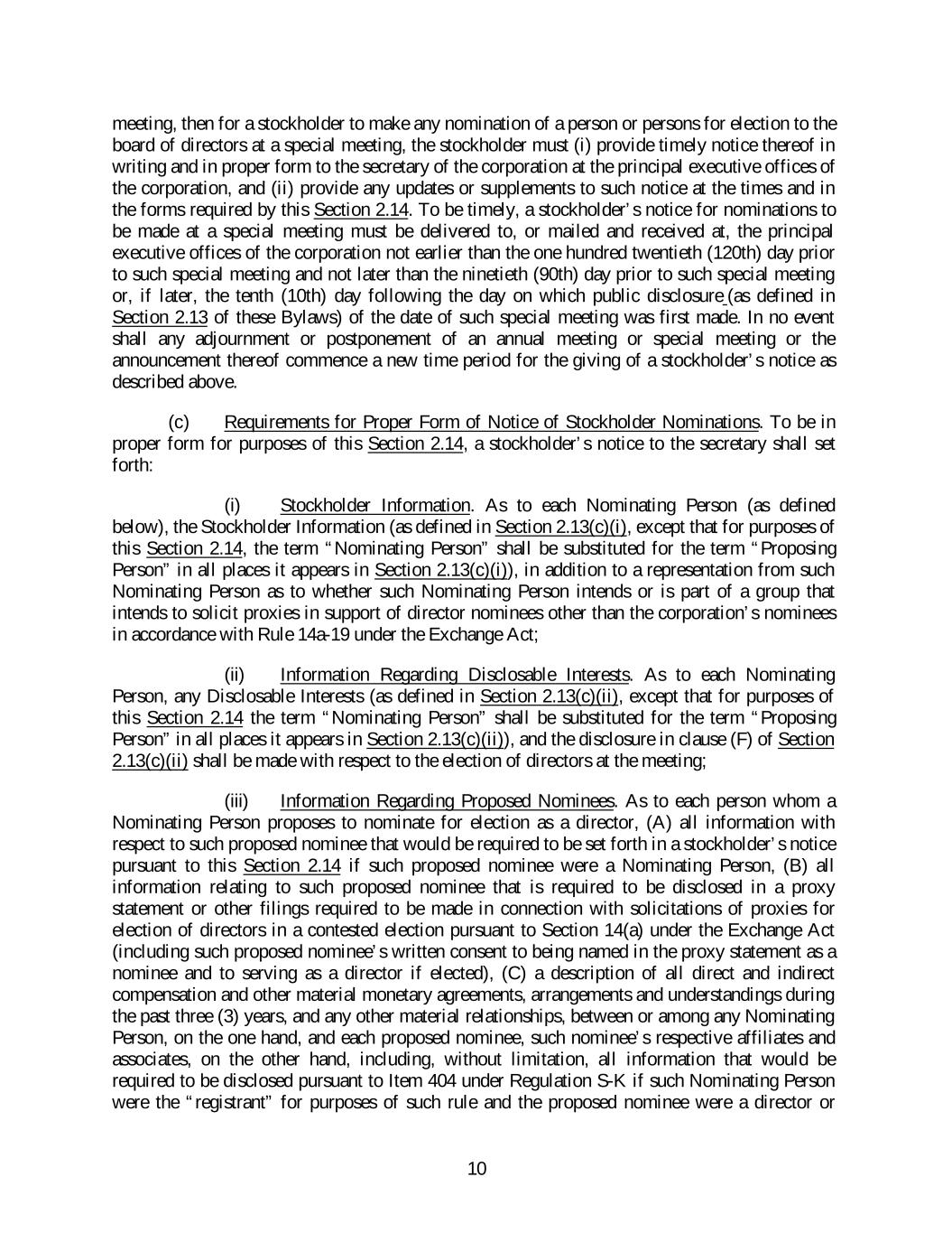 meeting, then for a stockholder to make any nomination of a person or persons for election to the board of directors at a special meeting, the stockholder must (i) provide timely notice thereof in writing and in proper form to the secretary of the corporation at the principal executive offices of the corporation, and (ii) provide any updates or supplements to such notice at the times and in the forms required by this Section 2.14. To be timely, a stockholder’s notice for nominations to be made at a special meeting must be delivered to, or mailed and received at, the principal executive offices of the corporation not earlier than the one hundred twentieth (120th) day prior to such special meeting and not later than the ninetieth (90th) day prior to such special meeting or, if later, the tenth (10th) day following the day on which public disclosure (as defined in Section 2.13 of these Bylaws) of the date of such special meeting was first made. In no event shall any adjournment or postponement of an annual meeting or special meeting or the announcement thereof commence a new time period for the giving of a stockholder’s notice as described above. (c) Requirements for Proper Form of Notice of Stockholder Nominations. To be in proper form for purposes of this Section 2.14, a stockholder’s notice to the secretary shall set forth: (i) Stockholder Information. As to each Nominating Person (as defined below), the Stockholder Information (as defined in Section 2.13(c)(i), except that for purposes of this Section 2.14, the term “Nominating Person” shall be substituted for the term “Proposing Person” in all places it appears in Section 2.13(c)(i)), in addition to a representation from such Nominating Person as to whether such Nominating Person intends or is part of a group that intends to solicit proxies in support of director nominees other than the corporation’s nominees in accordance with Rule 14a-19 under the Exchange Act; (ii) Information Regarding Disclosable Interests. As to each Nominating Person, any Disclosable Interests (as defined in Section 2.13(c)(ii), except that for purposes of this Section 2.14 the term “Nominating Person” shall be substituted for the term “Proposing Person” in all places it appears in Section 2.13(c)(ii)), and the disclosure in clause (F) of Section 2.13(c)(ii) shall be made with respect to the election of directors at the meeting; (iii) Information Regarding Proposed Nominees. As to each person whom a Nominating Person proposes to nominate for election as a director, (A) all information with respect to such proposed nominee that would be required to be set forth in a stockholder’s notice pursuant to this Section 2.14 if such proposed nominee were a Nominating Person, (B) all information relating to such proposed nominee that is required to be disclosed in a proxy statement or other filings required to be made in connection with solicitations of proxies for election of directors in a contested election pursuant to Section 14(a) under the Exchange Act (including such proposed nominee’s written consent to being named in the proxy statement as a nominee and to serving as a director if elected), (C) a description of all direct and indirect compensation and other material monetary agreements, arrangements and understandings during the past three (3) years, and any other material relationships, between or among any Nominating Person, on the one hand, and each proposed nominee, such nominee’s respective affiliates and associates, on the other hand, including, without limitation, all information that would be required to be disclosed pursuant to Item 404 under Regulation S-K if such Nominating Person were the “registrant” for purposes of such rule and the proposed nominee were a director or 10