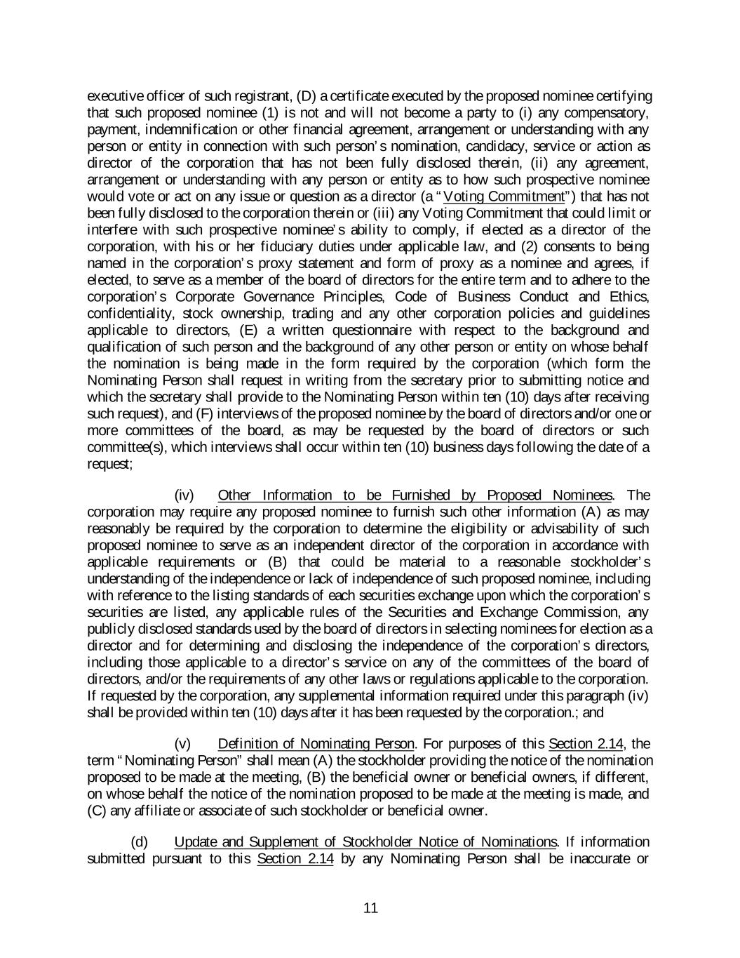 executive officer of such registrant, (D) a certificate executed by the proposed nominee certifying that such proposed nominee (1) is not and will not become a party to (i) any compensatory, payment, indemnification or other financial agreement, arrangement or understanding with any person or entity in connection with such person’s nomination, candidacy, service or action as director of the corporation that has not been fully disclosed therein, (ii) any agreement, arrangement or understanding with any person or entity as to how such prospective nominee would vote or act on any issue or question as a director (a “Voting Commitment”) that has not been fully disclosed to the corporation therein or (iii) any Voting Commitment that could limit or interfere with such prospective nominee’s ability to comply, if elected as a director of the corporation, with his or her fiduciary duties under applicable law, and (2) consents to being named in the corporation’s proxy statement and form of proxy as a nominee and agrees, if elected, to serve as a member of the board of directors for the entire term and to adhere to the corporation’s Corporate Governance Principles, Code of Business Conduct and Ethics, confidentiality, stock ownership, trading and any other corporation policies and guidelines applicable to directors, (E) a written questionnaire with respect to the background and qualification of such person and the background of any other person or entity on whose behalf the nomination is being made in the form required by the corporation (which form the Nominating Person shall request in writing from the secretary prior to submitting notice and which the secretary shall provide to the Nominating Person within ten (10) days after receiving such request), and (F) interviews of the proposed nominee by the board of directors and/or one or more committees of the board, as may be requested by the board of directors or such committee(s), which interviews shall occur within ten (10) business days following the date of a request; (iv) Other Information to be Furnished by Proposed Nominees. The corporation may require any proposed nominee to furnish such other information (A) as may reasonably be required by the corporation to determine the eligibility or advisability of such proposed nominee to serve as an independent director of the corporation in accordance with applicable requirements or (B) that could be material to a reasonable stockholder’s understanding of the independence or lack of independence of such proposed nominee, including with reference to the listing standards of each securities exchange upon which the corporation’s securities are listed, any applicable rules of the Securities and Exchange Commission, any publicly disclosed standards used by the board of directors in selecting nominees for election as a director and for determining and disclosing the independence of the corporation’s directors, including those applicable to a director’s service on any of the committees of the board of directors, and/or the requirements of any other laws or regulations applicable to the corporation. If requested by the corporation, any supplemental information required under this paragraph (iv) shall be provided within ten (10) days after it has been requested by the corporation.; and (v) Definition of Nominating Person. For purposes of this Section 2.14, the term “Nominating Person” shall mean (A) the stockholder providing the notice of the nomination proposed to be made at the meeting, (B) the beneficial owner or beneficial owners, if different, on whose behalf the notice of the nomination proposed to be made at the meeting is made, and (C) any affiliate or associate of such stockholder or beneficial owner. (d) Update and Supplement of Stockholder Notice of Nominations. If information submitted pursuant to this Section 2.14 by any Nominating Person shall be inaccurate or 11