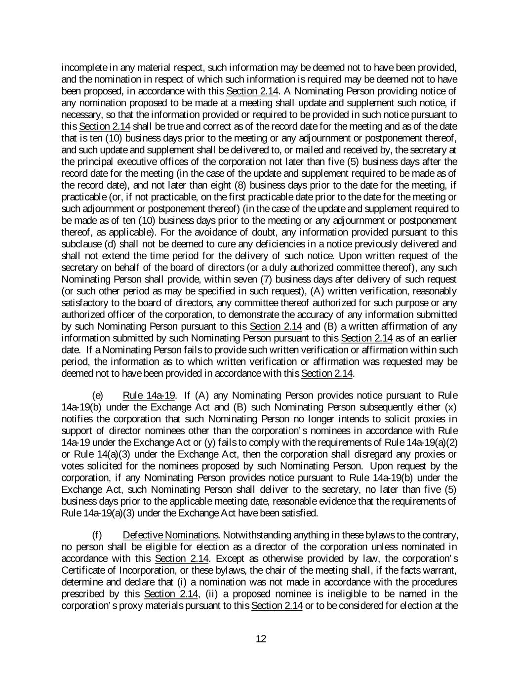 incomplete in any material respect, such information may be deemed not to have been provided, and the nomination in respect of which such information is required may be deemed not to have been proposed, in accordance with this Section 2.14. A Nominating Person providing notice of any nomination proposed to be made at a meeting shall update and supplement such notice, if necessary, so that the information provided or required to be provided in such notice pursuant to this Section 2.14 shall be true and correct as of the record date for the meeting and as of the date that is ten (10) business days prior to the meeting or any adjournment or postponement thereof, and such update and supplement shall be delivered to, or mailed and received by, the secretary at the principal executive offices of the corporation not later than five (5) business days after the record date for the meeting (in the case of the update and supplement required to be made as of the record date), and not later than eight (8) business days prior to the date for the meeting, if practicable (or, if not practicable, on the first practicable date prior to the date for the meeting or such adjournment or postponement thereof) (in the case of the update and supplement required to be made as of ten (10) business days prior to the meeting or any adjournment or postponement thereof, as applicable). For the avoidance of doubt, any information provided pursuant to this subclause (d) shall not be deemed to cure any deficiencies in a notice previously delivered and shall not extend the time period for the delivery of such notice. Upon written request of the secretary on behalf of the board of directors (or a duly authorized committee thereof), any such Nominating Person shall provide, within seven (7) business days after delivery of such request (or such other period as may be specified in such request), (A) written verification, reasonably satisfactory to the board of directors, any committee thereof authorized for such purpose or any authorized officer of the corporation, to demonstrate the accuracy of any information submitted by such Nominating Person pursuant to this Section 2.14 and (B) a written affirmation of any information submitted by such Nominating Person pursuant to this Section 2.14 as of an earlier date. If a Nominating Person fails to provide such written verification or affirmation within such period, the information as to which written verification or affirmation was requested may be deemed not to have been provided in accordance with this Section 2.14. (e) Rule 14a-19. If (A) any Nominating Person provides notice pursuant to Rule 14a-19(b) under the Exchange Act and (B) such Nominating Person subsequently either (x) notifies the corporation that such Nominating Person no longer intends to solicit proxies in support of director nominees other than the corporation’s nominees in accordance with Rule 14a-19 under the Exchange Act or (y) fails to comply with the requirements of Rule 14a-19(a)(2) or Rule 14(a)(3) under the Exchange Act, then the corporation shall disregard any proxies or votes solicited for the nominees proposed by such Nominating Person. Upon request by the corporation, if any Nominating Person provides notice pursuant to Rule 14a-19(b) under the Exchange Act, such Nominating Person shall deliver to the secretary, no later than five (5) business days prior to the applicable meeting date, reasonable evidence that the requirements of Rule 14a-19(a)(3) under the Exchange Act have been satisfied. (f) Defective Nominations. Notwithstanding anything in these bylaws to the contrary, no person shall be eligible for election as a director of the corporation unless nominated in accordance with this Section 2.14. Except as otherwise provided by law, the corporation’s Certificate of Incorporation, or these bylaws, the chair of the meeting shall, if the facts warrant, determine and declare that (i) a nomination was not made in accordance with the procedures prescribed by this Section 2.14, (ii) a proposed nominee is ineligible to be named in the corporation’s proxy materials pursuant to this Section 2.14 or to be considered for election at the 12