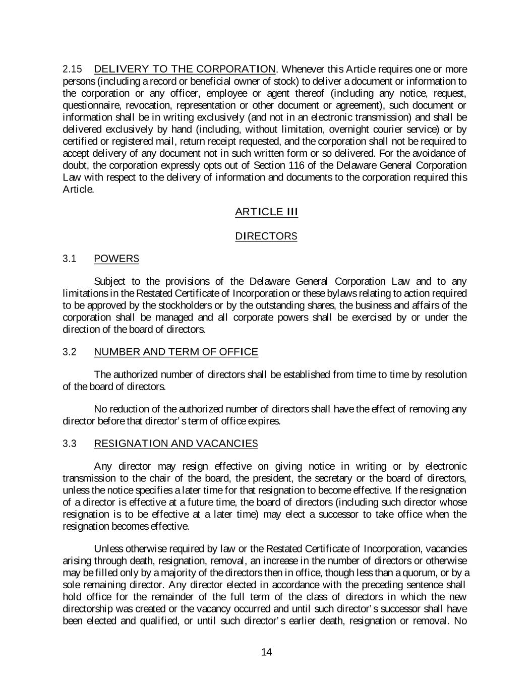 2.15 DELIVERY TO THE CORPORATION. Whenever this Article requires one or more persons (including a record or beneficial owner of stock) to deliver a document or information to the corporation or any officer, employee or agent thereof (including any notice, request, questionnaire, revocation, representation or other document or agreement), such document or information shall be in writing exclusively (and not in an electronic transmission) and shall be delivered exclusively by hand (including, without limitation, overnight courier service) or by certified or registered mail, return receipt requested, and the corporation shall not be required to accept delivery of any document not in such written form or so delivered. For the avoidance of doubt, the corporation expressly opts out of Section 116 of the Delaware General Corporation Law with respect to the delivery of information and documents to the corporation required this Article. ARTICLE III DIRECTORS 3.1 POWERS Subject to the provisions of the Delaware General Corporation Law and to any limitations in the Restated Certificate of Incorporation or these bylaws relating to action required to be approved by the stockholders or by the outstanding shares, the business and affairs of the corporation shall be managed and all corporate powers shall be exercised by or under the direction of the board of directors. 3.2 NUMBER AND TERM OF OFFICE The authorized number of directors shall be established from time to time by resolution of the board of directors. No reduction of the authorized number of directors shall have the effect of removing any director before that director’s term of office expires. 3.3 RESIGNATION AND VACANCIES Any director may resign effective on giving notice in writing or by electronic transmission to the chair of the board, the president, the secretary or the board of directors, unless the notice specifies a later time for that resignation to become effective. If the resignation of a director is effective at a future time, the board of directors (including such director whose resignation is to be effective at a later time) may elect a successor to take office when the resignation becomes effective. Unless otherwise required by law or the Restated Certificate of Incorporation, vacancies arising through death, resignation, removal, an increase in the number of directors or otherwise may be filled only by a majority of the directors then in office, though less than a quorum, or by a sole remaining director. Any director elected in accordance with the preceding sentence shall hold office for the remainder of the full term of the class of directors in which the new directorship was created or the vacancy occurred and until such director’s successor shall have been elected and qualified, or until such director’s earlier death, resignation or removal. No 14