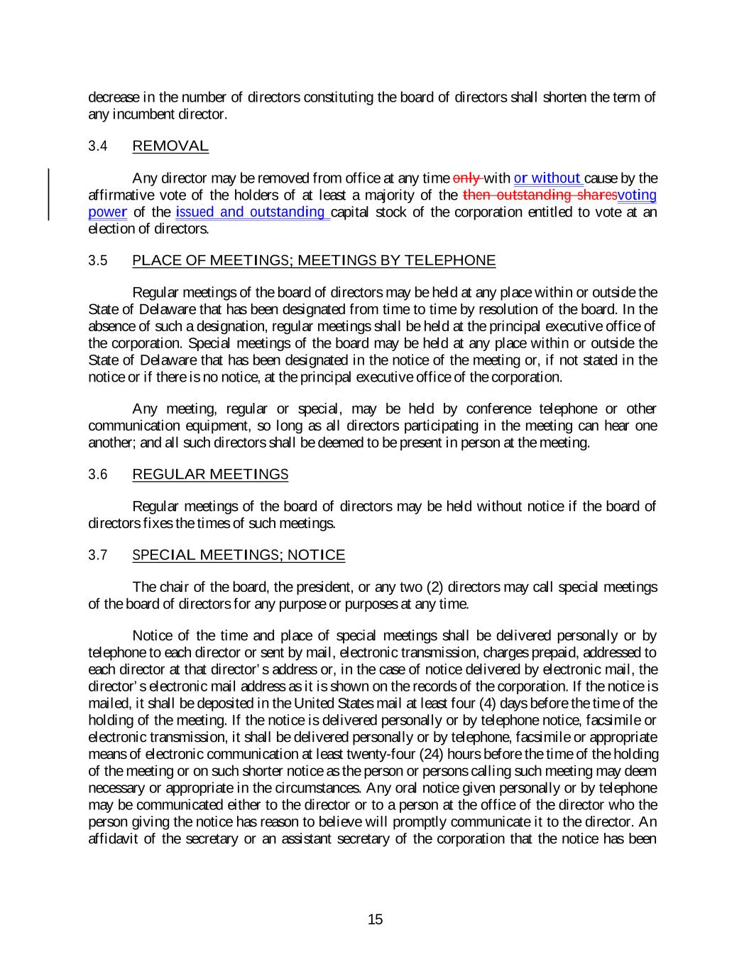 decrease in the number of directors constituting the board of directors shall shorten the term of any incumbent director. 3.4 REMOVAL Any director may be removed from office at any time only with or without cause by the affirmative vote of the holders of at least a majority of the then outstanding sharesvoting power of the issued and outstanding capital stock of the corporation entitled to vote at an election of directors. 3.5 PLACE OF MEETINGS; MEETINGS BY TELEPHONE Regular meetings of the board of directors may be held at any place within or outside the State of Delaware that has been designated from time to time by resolution of the board. In the absence of such a designation, regular meetings shall be held at the principal executive office of the corporation. Special meetings of the board may be held at any place within or outside the State of Delaware that has been designated in the notice of the meeting or, if not stated in the notice or if there is no notice, at the principal executive office of the corporation. Any meeting, regular or special, may be held by conference telephone or other communication equipment, so long as all directors participating in the meeting can hear one another; and all such directors shall be deemed to be present in person at the meeting. 3.6 REGULAR MEETINGS Regular meetings of the board of directors may be held without notice if the board of directors fixes the times of such meetings. 3.7 SPECIAL MEETINGS; NOTICE The chair of the board, the president, or any two (2) directors may call special meetings of the board of directors for any purpose or purposes at any time. Notice of the time and place of special meetings shall be delivered personally or by telephone to each director or sent by mail, electronic transmission, charges prepaid, addressed to each director at that director’s address or, in the case of notice delivered by electronic mail, the director’s electronic mail address as it is shown on the records of the corporation. If the notice is mailed, it shall be deposited in the United States mail at least four (4) days before the time of the holding of the meeting. If the notice is delivered personally or by telephone notice, facsimile or electronic transmission, it shall be delivered personally or by telephone, facsimile or appropriate means of electronic communication at least twenty-four (24) hours before the time of the holding of the meeting or on such shorter notice as the person or persons calling such meeting may deem necessary or appropriate in the circumstances. Any oral notice given personally or by telephone may be communicated either to the director or to a person at the office of the director who the person giving the notice has reason to believe will promptly communicate it to the director. An affidavit of the secretary or an assistant secretary of the corporation that the notice has been 15