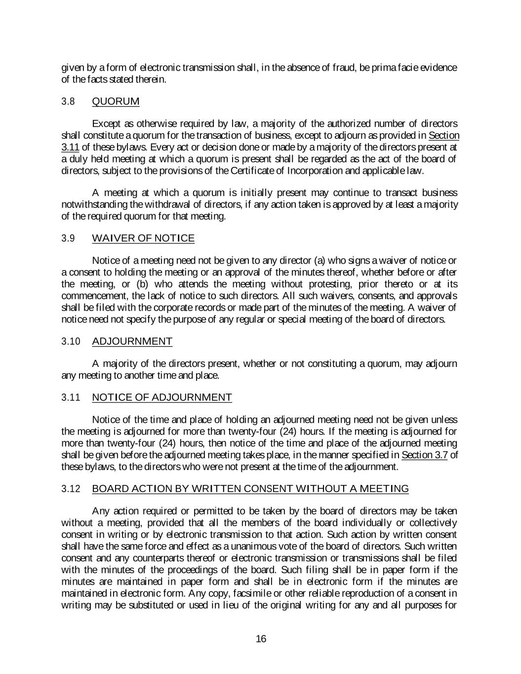 given by a form of electronic transmission shall, in the absence of fraud, be prima facie evidence of the facts stated therein. 3.8 QUORUM Except as otherwise required by law, a majority of the authorized number of directors shall constitute a quorum for the transaction of business, except to adjourn as provided in Section 3.11 of these bylaws. Every act or decision done or made by a majority of the directors present at a duly held meeting at which a quorum is present shall be regarded as the act of the board of directors, subject to the provisions of the Certificate of Incorporation and applicable law. A meeting at which a quorum is initially present may continue to transact business notwithstanding the withdrawal of directors, if any action taken is approved by at least a majority of the required quorum for that meeting. 3.9 WAIVER OF NOTICE Notice of a meeting need not be given to any director (a) who signs a waiver of notice or a consent to holding the meeting or an approval of the minutes thereof, whether before or after the meeting, or (b) who attends the meeting without protesting, prior thereto or at its commencement, the lack of notice to such directors. All such waivers, consents, and approvals shall be filed with the corporate records or made part of the minutes of the meeting. A waiver of notice need not specify the purpose of any regular or special meeting of the board of directors. 3.10 ADJOURNMENT A majority of the directors present, whether or not constituting a quorum, may adjourn any meeting to another time and place. 3.11 NOTICE OF ADJOURNMENT Notice of the time and place of holding an adjourned meeting need not be given unless the meeting is adjourned for more than twenty-four (24) hours. If the meeting is adjourned for more than twenty-four (24) hours, then notice of the time and place of the adjourned meeting shall be given before the adjourned meeting takes place, in the manner specified in Section 3.7 of these bylaws, to the directors who were not present at the time of the adjournment. 3.12 BOARD ACTION BY WRITTEN CONSENT WITHOUT A MEETING Any action required or permitted to be taken by the board of directors may be taken without a meeting, provided that all the members of the board individually or collectively consent in writing or by electronic transmission to that action. Such action by written consent shall have the same force and effect as a unanimous vote of the board of directors. Such written consent and any counterparts thereof or electronic transmission or transmissions shall be filed with the minutes of the proceedings of the board. Such filing shall be in paper form if the minutes are maintained in paper form and shall be in electronic form if the minutes are maintained in electronic form. Any copy, facsimile or other reliable reproduction of a consent in writing may be substituted or used in lieu of the original writing for any and all purposes for 16