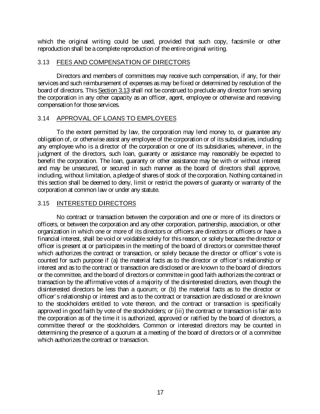 which the original writing could be used, provided that such copy, facsimile or other reproduction shall be a complete reproduction of the entire original writing. 3.13 FEES AND COMPENSATION OF DIRECTORS Directors and members of committees may receive such compensation, if any, for their services and such reimbursement of expenses as may be fixed or determined by resolution of the board of directors. This Section 3.13 shall not be construed to preclude any director from serving the corporation in any other capacity as an officer, agent, employee or otherwise and receiving compensation for those services. 3.14 APPROVAL OF LOANS TO EMPLOYEES To the extent permitted by law, the corporation may lend money to, or guarantee any obligation of, or otherwise assist any employee of the corporation or of its subsidiaries, including any employee who is a director of the corporation or one of its subsidiaries, whenever, in the judgment of the directors, such loan, guaranty or assistance may reasonably be expected to benefit the corporation. The loan, guaranty or other assistance may be with or without interest and may be unsecured, or secured in such manner as the board of directors shall approve, including, without limitation, a pledge of shares of stock of the corporation. Nothing contained in this section shall be deemed to deny, limit or restrict the powers of guaranty or warranty of the corporation at common law or under any statute. 3.15 INTERESTED DIRECTORS No contract or transaction between the corporation and one or more of its directors or officers, or between the corporation and any other corporation, partnership, association, or other organization in which one or more of its directors or officers are directors or officers or have a financial interest, shall be void or voidable solely for this reason, or solely because the director or officer is present at or participates in the meeting of the board of directors or committee thereof which authorizes the contract or transaction, or solely because the director or officer’s vote is counted for such purpose if (a) the material facts as to the director or officer’s relationship or interest and as to the contract or transaction are disclosed or are known to the board of directors or the committee, and the board of directors or committee in good faith authorizes the contract or transaction by the affirmative votes of a majority of the disinterested directors, even though the disinterested directors be less than a quorum; or (b) the material facts as to the director or officer’s relationship or interest and as to the contract or transaction are disclosed or are known to the stockholders entitled to vote thereon, and the contract or transaction is specifically approved in good faith by vote of the stockholders; or (iii) the contract or transaction is fair as to the corporation as of the time it is authorized, approved or ratified by the board of directors, a committee thereof or the stockholders. Common or interested directors may be counted in determining the presence of a quorum at a meeting of the board of directors or of a committee which authorizes the contract or transaction. 17