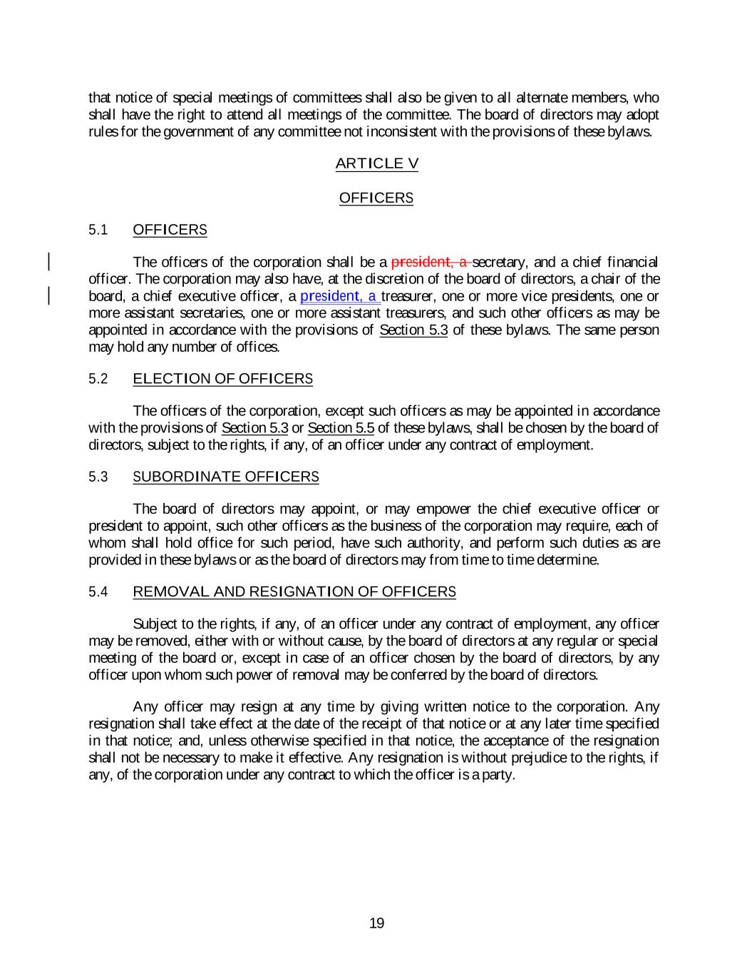 that notice of special meetings of committees shall also be given to all alternate members, who shall have the right to attend all meetings of the committee. The board of directors may adopt rules for the government of any committee not inconsistent with the provisions of these bylaws. ARTICLE V OFFICERS 5.1 OFFICERS The officers of the corporation shall be a president, a secretary, and a chief financial officer. The corporation may also have, at the discretion of the board of directors, a chair of the board, a chief executive officer, a president, a treasurer, one or more vice presidents, one or more assistant secretaries, one or more assistant treasurers, and such other officers as may be appointed in accordance with the provisions of Section 5.3 of these bylaws. The same person may hold any number of offices. 5.2 ELECTION OF OFFICERS The officers of the corporation, except such officers as may be appointed in accordance with the provisions of Section 5.3 or Section 5.5 of these bylaws, shall be chosen by the board of directors, subject to the rights, if any, of an officer under any contract of employment. 5.3 SUBORDINATE OFFICERS The board of directors may appoint, or may empower the chief executive officer or president to appoint, such other officers as the business of the corporation may require, each of whom shall hold office for such period, have such authority, and perform such duties as are provided in these bylaws or as the board of directors may from time to time determine. 5.4 REMOVAL AND RESIGNATION OF OFFICERS Subject to the rights, if any, of an officer under any contract of employment, any officer may be removed, either with or without cause, by the board of directors at any regular or special meeting of the board or, except in case of an officer chosen by the board of directors, by any officer upon whom such power of removal may be conferred by the board of directors. Any officer may resign at any time by giving written notice to the corporation. Any resignation shall take effect at the date of the receipt of that notice or at any later time specified in that notice; and, unless otherwise specified in that notice, the acceptance of the resignation shall not be necessary to make it effective. Any resignation is without prejudice to the rights, if any, of the corporation under any contract to which the officer is a party. 19