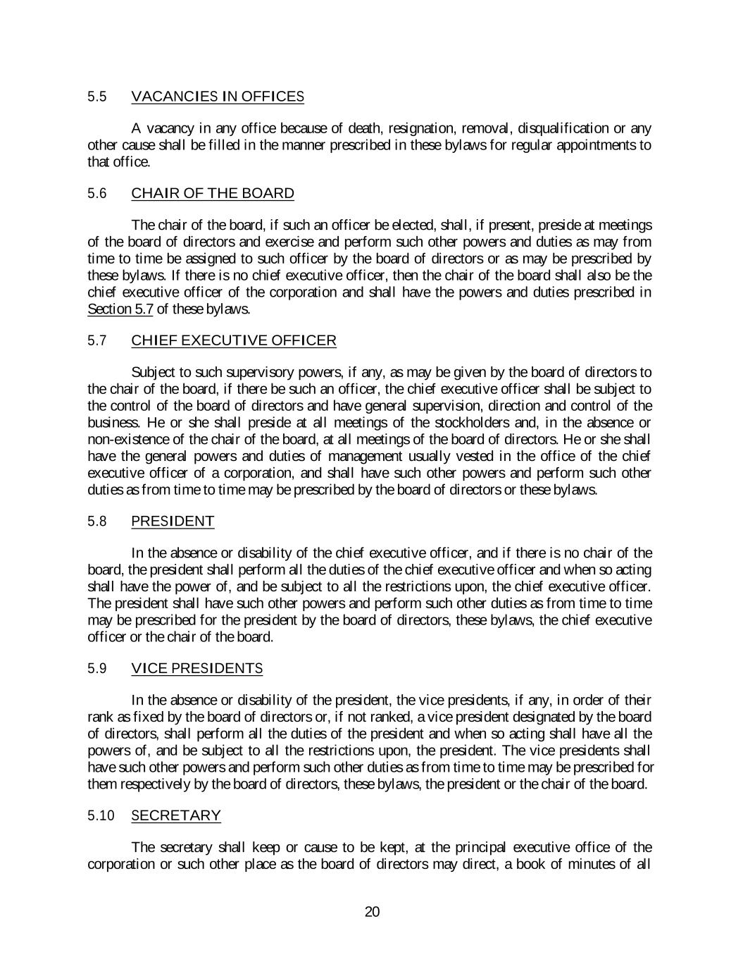 5.5 VACANCIES IN OFFICES A vacancy in any office because of death, resignation, removal, disqualification or any other cause shall be filled in the manner prescribed in these bylaws for regular appointments to that office. 5.6 CHAIR OF THE BOARD The chair of the board, if such an officer be elected, shall, if present, preside at meetings of the board of directors and exercise and perform such other powers and duties as may from time to time be assigned to such officer by the board of directors or as may be prescribed by these bylaws. If there is no chief executive officer, then the chair of the board shall also be the chief executive officer of the corporation and shall have the powers and duties prescribed in Section 5.7 of these bylaws. 5.7 CHIEF EXECUTIVE OFFICER Subject to such supervisory powers, if any, as may be given by the board of directors to the chair of the board, if there be such an officer, the chief executive officer shall be subject to the control of the board of directors and have general supervision, direction and control of the business. He or she shall preside at all meetings of the stockholders and, in the absence or non-existence of the chair of the board, at all meetings of the board of directors. He or she shall have the general powers and duties of management usually vested in the office of the chief executive officer of a corporation, and shall have such other powers and perform such other duties as from time to time may be prescribed by the board of directors or these bylaws. 5.8 PRESIDENT In the absence or disability of the chief executive officer, and if there is no chair of the board, the president shall perform all the duties of the chief executive officer and when so acting shall have the power of, and be subject to all the restrictions upon, the chief executive officer. The president shall have such other powers and perform such other duties as from time to time may be prescribed for the president by the board of directors, these bylaws, the chief executive officer or the chair of the board. 5.9 VICE PRESIDENTS In the absence or disability of the president, the vice presidents, if any, in order of their rank as fixed by the board of directors or, if not ranked, a vice president designated by the board of directors, shall perform all the duties of the president and when so acting shall have all the powers of, and be subject to all the restrictions upon, the president. The vice presidents shall have such other powers and perform such other duties as from time to time may be prescribed for them respectively by the board of directors, these bylaws, the president or the chair of the board. 5.10 SECRETARY The secretary shall keep or cause to be kept, at the principal executive office of the corporation or such other place as the board of directors may direct, a book of minutes of all 20