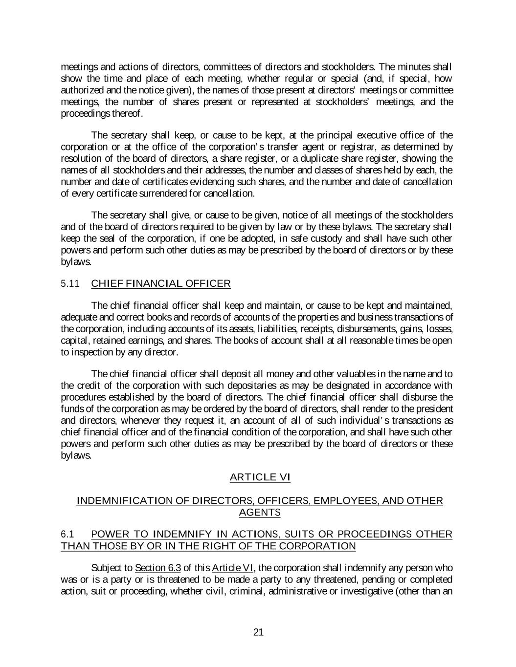 meetings and actions of directors, committees of directors and stockholders. The minutes shall show the time and place of each meeting, whether regular or special (and, if special, how authorized and the notice given), the names of those present at directors’ meetings or committee meetings, the number of shares present or represented at stockholders’ meetings, and the proceedings thereof. The secretary shall keep, or cause to be kept, at the principal executive office of the corporation or at the office of the corporation’s transfer agent or registrar, as determined by resolution of the board of directors, a share register, or a duplicate share register, showing the names of all stockholders and their addresses, the number and classes of shares held by each, the number and date of certificates evidencing such shares, and the number and date of cancellation of every certificate surrendered for cancellation. The secretary shall give, or cause to be given, notice of all meetings of the stockholders and of the board of directors required to be given by law or by these bylaws. The secretary shall keep the seal of the corporation, if one be adopted, in safe custody and shall have such other powers and perform such other duties as may be prescribed by the board of directors or by these bylaws. 5.11 CHIEF FINANCIAL OFFICER The chief financial officer shall keep and maintain, or cause to be kept and maintained, adequate and correct books and records of accounts of the properties and business transactions of the corporation, including accounts of its assets, liabilities, receipts, disbursements, gains, losses, capital, retained earnings, and shares. The books of account shall at all reasonable times be open to inspection by any director. The chief financial officer shall deposit all money and other valuables in the name and to the credit of the corporation with such depositaries as may be designated in accordance with procedures established by the board of directors. The chief financial officer shall disburse the funds of the corporation as may be ordered by the board of directors, shall render to the president and directors, whenever they request it, an account of all of such individual’s transactions as chief financial officer and of the financial condition of the corporation, and shall have such other powers and perform such other duties as may be prescribed by the board of directors or these bylaws. ARTICLE VI INDEMNIFICATION OF DIRECTORS, OFFICERS, EMPLOYEES, AND OTHER AGENTS 6.1 POWER TO INDEMNIFY IN ACTIONS, SUITS OR PROCEEDINGS OTHER THAN THOSE BY OR IN THE RIGHT OF THE CORPORATION Subject to Section 6.3 of this Article VI, the corporation shall indemnify any person who was or is a party or is threatened to be made a party to any threatened, pending or completed action, suit or proceeding, whether civil, criminal, administrative or investigative (other than an 21
