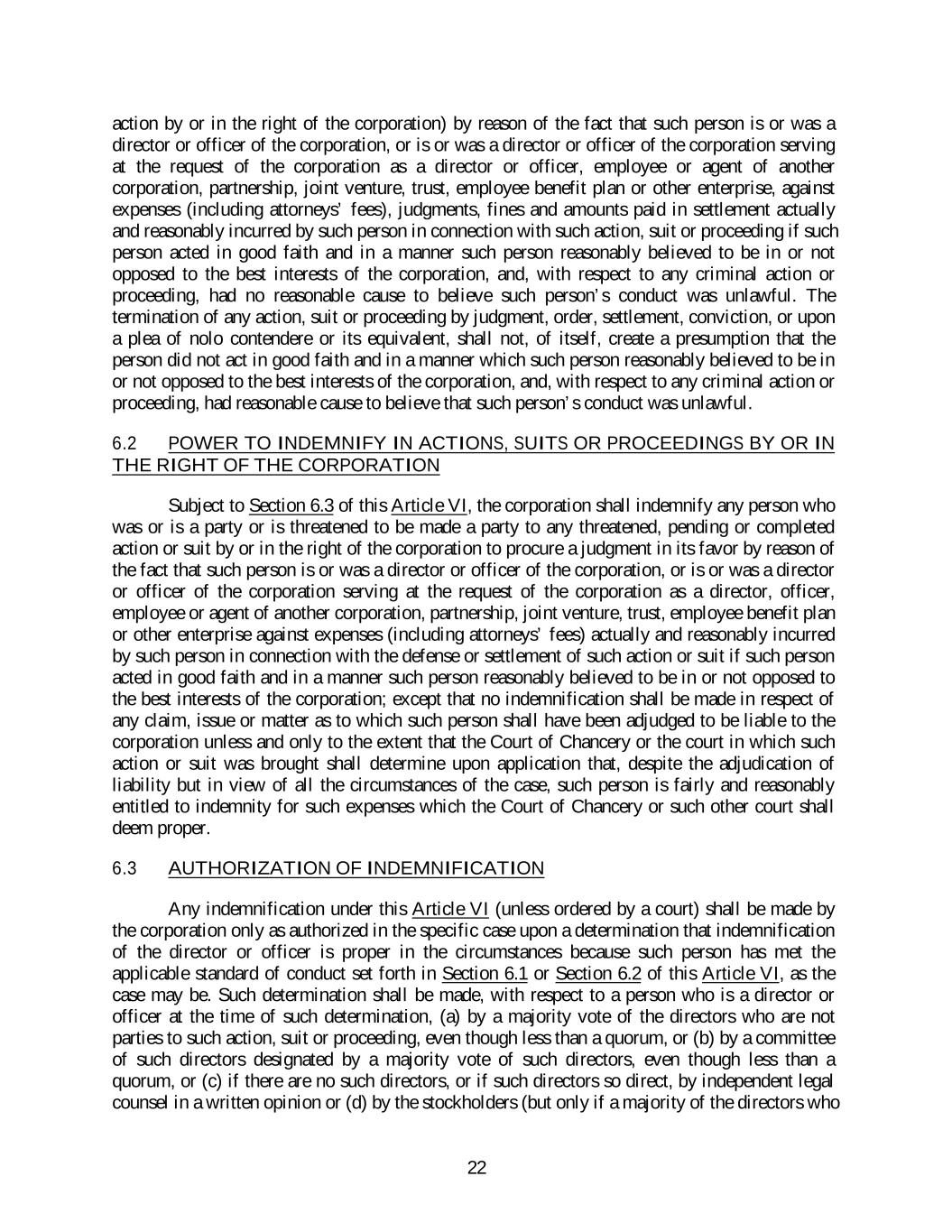 action by or in the right of the corporation) by reason of the fact that such person is or was a director or officer of the corporation, or is or was a director or officer of the corporation serving at the request of the corporation as a director or officer, employee or agent of another corporation, partnership, joint venture, trust, employee benefit plan or other enterprise, against expenses (including attorneys’ fees), judgments, fines and amounts paid in settlement actually and reasonably incurred by such person in connection with such action, suit or proceeding if such person acted in good faith and in a manner such person reasonably believed to be in or not opposed to the best interests of the corporation, and, with respect to any criminal action or proceeding, had no reasonable cause to believe such person’s conduct was unlawful. The termination of any action, suit or proceeding by judgment, order, settlement, conviction, or upon a plea of nolo contendere or its equivalent, shall not, of itself, create a presumption that the person did not act in good faith and in a manner which such person reasonably believed to be in or not opposed to the best interests of the corporation, and, with respect to any criminal action or proceeding, had reasonable cause to believe that such person’s conduct was unlawful. 6.2 POWER TO INDEMNIFY IN ACTIONS, SUITS OR PROCEEDINGS BY OR IN THE RIGHT OF THE CORPORATION Subject to Section 6.3 of this Article VI, the corporation shall indemnify any person who was or is a party or is threatened to be made a party to any threatened, pending or completed action or suit by or in the right of the corporation to procure a judgment in its favor by reason of the fact that such person is or was a director or officer of the corporation, or is or was a director or officer of the corporation serving at the request of the corporation as a director, officer, employee or agent of another corporation, partnership, joint venture, trust, employee benefit plan or other enterprise against expenses (including attorneys’ fees) actually and reasonably incurred by such person in connection with the defense or settlement of such action or suit if such person acted in good faith and in a manner such person reasonably believed to be in or not opposed to the best interests of the corporation; except that no indemnification shall be made in respect of any claim, issue or matter as to which such person shall have been adjudged to be liable to the corporation unless and only to the extent that the Court of Chancery or the court in which such action or suit was brought shall determine upon application that, despite the adjudication of liability but in view of all the circumstances of the case, such person is fairly and reasonably entitled to indemnity for such expenses which the Court of Chancery or such other court shall deem proper. 6.3 AUTHORIZATION OF INDEMNIFICATION Any indemnification under this Article VI (unless ordered by a court) shall be made by the corporation only as authorized in the specific case upon a determination that indemnification of the director or officer is proper in the circumstances because such person has met the applicable standard of conduct set forth in Section 6.1 or Section 6.2 of this Article VI, as the case may be. Such determination shall be made, with respect to a person who is a director or officer at the time of such determination, (a) by a majority vote of the directors who are not parties to such action, suit or proceeding, even though less than a quorum, or (b) by a committee of such directors designated by a majority vote of such directors, even though less than a quorum, or (c) if there are no such directors, or if such directors so direct, by independent legal counsel in a written opinion or (d) by the stockholders (but only if a majority of the directors who 22