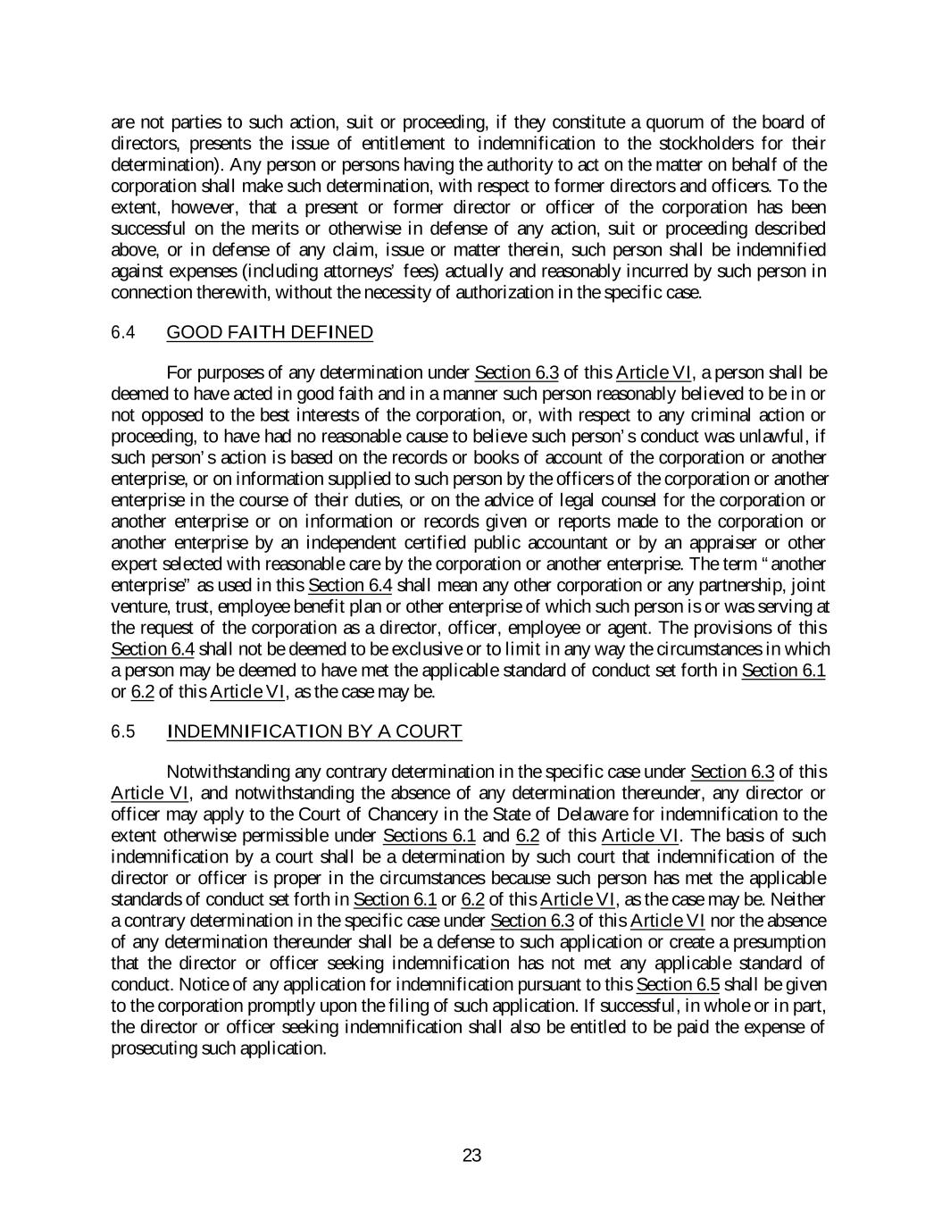 are not parties to such action, suit or proceeding, if they constitute a quorum of the board of directors, presents the issue of entitlement to indemnification to the stockholders for their determination). Any person or persons having the authority to act on the matter on behalf of the corporation shall make such determination, with respect to former directors and officers. To the extent, however, that a present or former director or officer of the corporation has been successful on the merits or otherwise in defense of any action, suit or proceeding described above, or in defense of any claim, issue or matter therein, such person shall be indemnified against expenses (including attorneys’ fees) actually and reasonably incurred by such person in connection therewith, without the necessity of authorization in the specific case. 6.4 GOOD FAITH DEFINED For purposes of any determination under Section 6.3 of this Article VI, a person shall be deemed to have acted in good faith and in a manner such person reasonably believed to be in or not opposed to the best interests of the corporation, or, with respect to any criminal action or proceeding, to have had no reasonable cause to believe such person’s conduct was unlawful, if such person’s action is based on the records or books of account of the corporation or another enterprise, or on information supplied to such person by the officers of the corporation or another enterprise in the course of their duties, or on the advice of legal counsel for the corporation or another enterprise or on information or records given or reports made to the corporation or another enterprise by an independent certified public accountant or by an appraiser or other expert selected with reasonable care by the corporation or another enterprise. The term “another enterprise” as used in this Section 6.4 shall mean any other corporation or any partnership, joint venture, trust, employee benefit plan or other enterprise of which such person is or was serving at the request of the corporation as a director, officer, employee or agent. The provisions of this Section 6.4 shall not be deemed to be exclusive or to limit in any way the circumstances in which a person may be deemed to have met the applicable standard of conduct set forth in Section 6.1 or 6.2 of this Article VI, as the case may be. 6.5 INDEMNIFICATION BY A COURT Notwithstanding any contrary determination in the specific case under Section 6.3 of this Article VI, and notwithstanding the absence of any determination thereunder, any director or officer may apply to the Court of Chancery in the State of Delaware for indemnification to the extent otherwise permissible under Sections 6.1 and 6.2 of this Article VI. The basis of such indemnification by a court shall be a determination by such court that indemnification of the director or officer is proper in the circumstances because such person has met the applicable standards of conduct set forth in Section 6.1 or 6.2 of this Article VI, as the case may be. Neither a contrary determination in the specific case under Section 6.3 of this Article VI nor the absence of any determination thereunder shall be a defense to such application or create a presumption that the director or officer seeking indemnification has not met any applicable standard of conduct. Notice of any application for indemnification pursuant to this Section 6.5 shall be given to the corporation promptly upon the filing of such application. If successful, in whole or in part, the director or officer seeking indemnification shall also be entitled to be paid the expense of prosecuting such application. 23