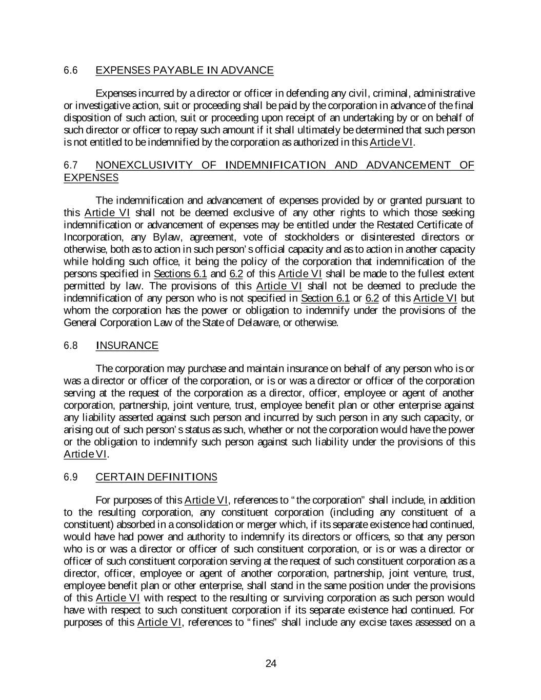 6.6 EXPENSES PAYABLE IN ADVANCE Expenses incurred by a director or officer in defending any civil, criminal, administrative or investigative action, suit or proceeding shall be paid by the corporation in advance of the final disposition of such action, suit or proceeding upon receipt of an undertaking by or on behalf of such director or officer to repay such amount if it shall ultimately be determined that such person is not entitled to be indemnified by the corporation as authorized in this Article VI. 6.7 NONEXCLUSIVITY OF INDEMNIFICATION AND ADVANCEMENT OF EXPENSES The indemnification and advancement of expenses provided by or granted pursuant to this Article VI shall not be deemed exclusive of any other rights to which those seeking indemnification or advancement of expenses may be entitled under the Restated Certificate of Incorporation, any Bylaw, agreement, vote of stockholders or disinterested directors or otherwise, both as to action in such person’s official capacity and as to action in another capacity while holding such office, it being the policy of the corporation that indemnification of the persons specified in Sections 6.1 and 6.2 of this Article VI shall be made to the fullest extent permitted by law. The provisions of this Article VI shall not be deemed to preclude the indemnification of any person who is not specified in Section 6.1 or 6.2 of this Article VI but whom the corporation has the power or obligation to indemnify under the provisions of the General Corporation Law of the State of Delaware, or otherwise. 6.8 INSURANCE The corporation may purchase and maintain insurance on behalf of any person who is or was a director or officer of the corporation, or is or was a director or officer of the corporation serving at the request of the corporation as a director, officer, employee or agent of another corporation, partnership, joint venture, trust, employee benefit plan or other enterprise against any liability asserted against such person and incurred by such person in any such capacity, or arising out of such person’s status as such, whether or not the corporation would have the power or the obligation to indemnify such person against such liability under the provisions of this Article VI. 6.9 CERTAIN DEFINITIONS For purposes of this Article VI, references to “the corporation” shall include, in addition to the resulting corporation, any constituent corporation (including any constituent of a constituent) absorbed in a consolidation or merger which, if its separate existence had continued, would have had power and authority to indemnify its directors or officers, so that any person who is or was a director or officer of such constituent corporation, or is or was a director or officer of such constituent corporation serving at the request of such constituent corporation as a director, officer, employee or agent of another corporation, partnership, joint venture, trust, employee benefit plan or other enterprise, shall stand in the same position under the provisions of this Article VI with respect to the resulting or surviving corporation as such person would have with respect to such constituent corporation if its separate existence had continued. For purposes of this Article VI, references to “fines” shall include any excise taxes assessed on a 24