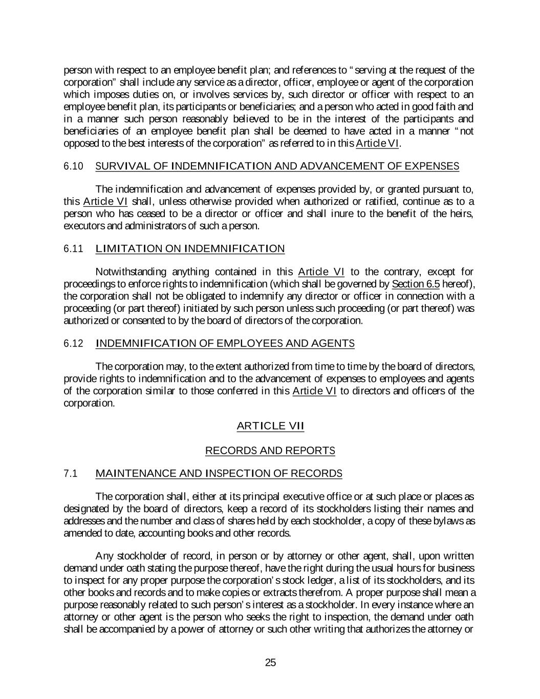 person with respect to an employee benefit plan; and references to “serving at the request of the corporation” shall include any service as a director, officer, employee or agent of the corporation which imposes duties on, or involves services by, such director or officer with respect to an employee benefit plan, its participants or beneficiaries; and a person who acted in good faith and in a manner such person reasonably believed to be in the interest of the participants and beneficiaries of an employee benefit plan shall be deemed to have acted in a manner “not opposed to the best interests of the corporation” as referred to in this Article VI. 6.10 SURVIVAL OF INDEMNIFICATION AND ADVANCEMENT OF EXPENSES The indemnification and advancement of expenses provided by, or granted pursuant to, this Article VI shall, unless otherwise provided when authorized or ratified, continue as to a person who has ceased to be a director or officer and shall inure to the benefit of the heirs, executors and administrators of such a person. 6.11 LIMITATION ON INDEMNIFICATION Notwithstanding anything contained in this Article VI to the contrary, except for proceedings to enforce rights to indemnification (which shall be governed by Section 6.5 hereof), the corporation shall not be obligated to indemnify any director or officer in connection with a proceeding (or part thereof) initiated by such person unless such proceeding (or part thereof) was authorized or consented to by the board of directors of the corporation. 6.12 INDEMNIFICATION OF EMPLOYEES AND AGENTS The corporation may, to the extent authorized from time to time by the board of directors, provide rights to indemnification and to the advancement of expenses to employees and agents of the corporation similar to those conferred in this Article VI to directors and officers of the corporation. ARTICLE VII RECORDS AND REPORTS 7.1 MAINTENANCE AND INSPECTION OF RECORDS The corporation shall, either at its principal executive office or at such place or places as designated by the board of directors, keep a record of its stockholders listing their names and addresses and the number and class of shares held by each stockholder, a copy of these bylaws as amended to date, accounting books and other records. Any stockholder of record, in person or by attorney or other agent, shall, upon written demand under oath stating the purpose thereof, have the right during the usual hours for business to inspect for any proper purpose the corporation’s stock ledger, a list of its stockholders, and its other books and records and to make copies or extracts therefrom. A proper purpose shall mean a purpose reasonably related to such person’s interest as a stockholder. In every instance where an attorney or other agent is the person who seeks the right to inspection, the demand under oath shall be accompanied by a power of attorney or such other writing that authorizes the attorney or 25