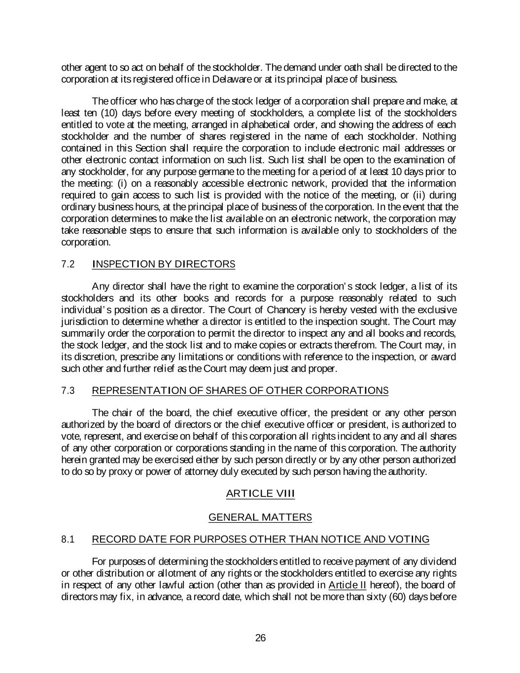 other agent to so act on behalf of the stockholder. The demand under oath shall be directed to the corporation at its registered office in Delaware or at its principal place of business. The officer who has charge of the stock ledger of a corporation shall prepare and make, at least ten (10) days before every meeting of stockholders, a complete list of the stockholders entitled to vote at the meeting, arranged in alphabetical order, and showing the address of each stockholder and the number of shares registered in the name of each stockholder. Nothing contained in this Section shall require the corporation to include electronic mail addresses or other electronic contact information on such list. Such list shall be open to the examination of any stockholder, for any purpose germane to the meeting for a period of at least 10 days prior to the meeting: (i) on a reasonably accessible electronic network, provided that the information required to gain access to such list is provided with the notice of the meeting, or (ii) during ordinary business hours, at the principal place of business of the corporation. In the event that the corporation determines to make the list available on an electronic network, the corporation may take reasonable steps to ensure that such information is available only to stockholders of the corporation. 7.2 INSPECTION BY DIRECTORS Any director shall have the right to examine the corporation’s stock ledger, a list of its stockholders and its other books and records for a purpose reasonably related to such individual’s position as a director. The Court of Chancery is hereby vested with the exclusive jurisdiction to determine whether a director is entitled to the inspection sought. The Court may summarily order the corporation to permit the director to inspect any and all books and records, the stock ledger, and the stock list and to make copies or extracts therefrom. The Court may, in its discretion, prescribe any limitations or conditions with reference to the inspection, or award such other and further relief as the Court may deem just and proper. 7.3 REPRESENTATION OF SHARES OF OTHER CORPORATIONS The chair of the board, the chief executive officer, the president or any other person authorized by the board of directors or the chief executive officer or president, is authorized to vote, represent, and exercise on behalf of this corporation all rights incident to any and all shares of any other corporation or corporations standing in the name of this corporation. The authority herein granted may be exercised either by such person directly or by any other person authorized to do so by proxy or power of attorney duly executed by such person having the authority. ARTICLE VIII GENERAL MATTERS 8.1 RECORD DATE FOR PURPOSES OTHER THAN NOTICE AND VOTING For purposes of determining the stockholders entitled to receive payment of any dividend or other distribution or allotment of any rights or the stockholders entitled to exercise any rights in respect of any other lawful action (other than as provided in Article II hereof), the board of directors may fix, in advance, a record date, which shall not be more than sixty (60) days before 26