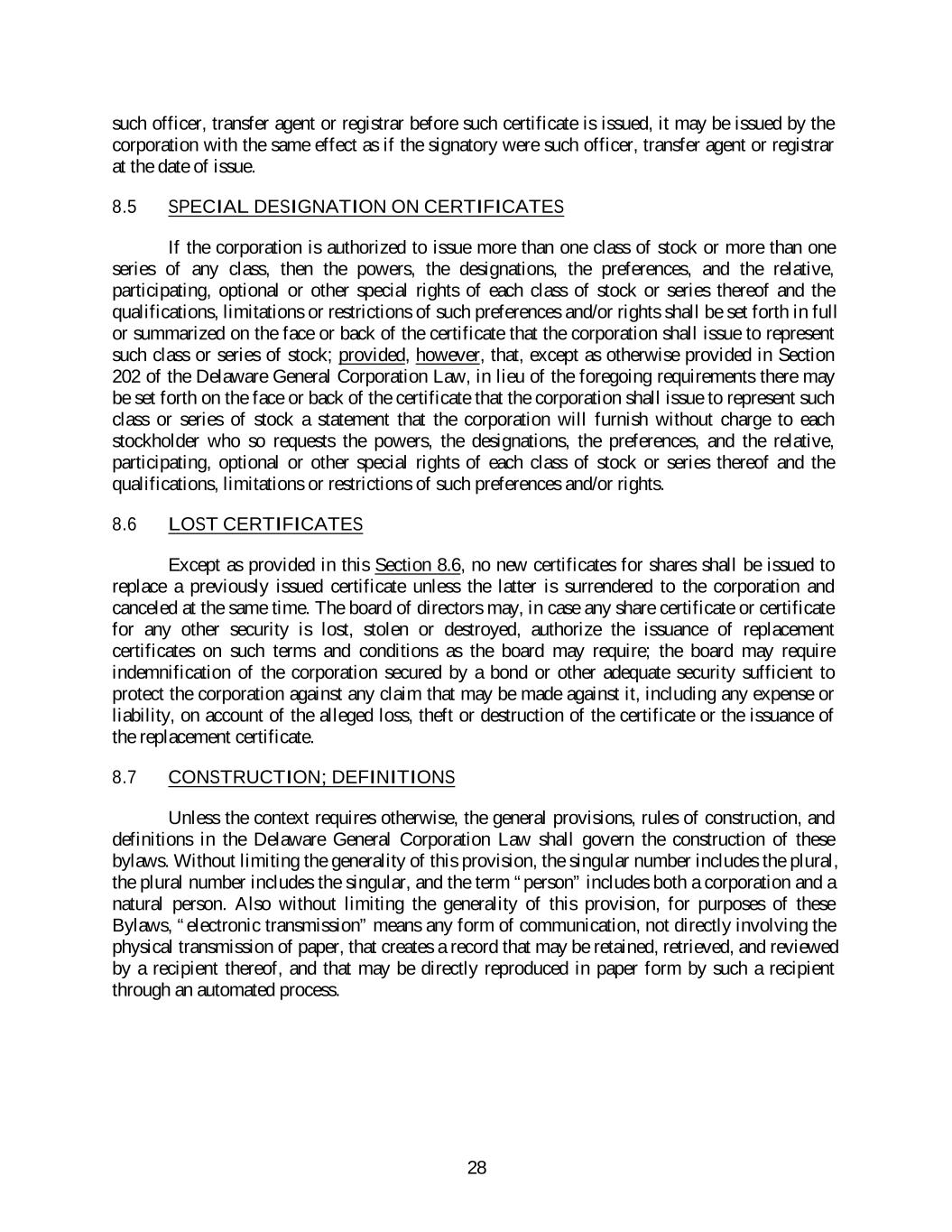 such officer, transfer agent or registrar before such certificate is issued, it may be issued by the corporation with the same effect as if the signatory were such officer, transfer agent or registrar at the date of issue. 8.5 SPECIAL DESIGNATION ON CERTIFICATES If the corporation is authorized to issue more than one class of stock or more than one series of any class, then the powers, the designations, the preferences, and the relative, participating, optional or other special rights of each class of stock or series thereof and the qualifications, limitations or restrictions of such preferences and/or rights shall be set forth in full or summarized on the face or back of the certificate that the corporation shall issue to represent such class or series of stock; provided, however, that, except as otherwise provided in Section 202 of the Delaware General Corporation Law, in lieu of the foregoing requirements there may be set forth on the face or back of the certificate that the corporation shall issue to represent such class or series of stock a statement that the corporation will furnish without charge to each stockholder who so requests the powers, the designations, the preferences, and the relative, participating, optional or other special rights of each class of stock or series thereof and the qualifications, limitations or restrictions of such preferences and/or rights. 8.6 LOST CERTIFICATES Except as provided in this Section 8.6, no new certificates for shares shall be issued to replace a previously issued certificate unless the latter is surrendered to the corporation and canceled at the same time. The board of directors may, in case any share certificate or certificate for any other security is lost, stolen or destroyed, authorize the issuance of replacement certificates on such terms and conditions as the board may require; the board may require indemnification of the corporation secured by a bond or other adequate security sufficient to protect the corporation against any claim that may be made against it, including any expense or liability, on account of the alleged loss, theft or destruction of the certificate or the issuance of the replacement certificate. 8.7 CONSTRUCTION; DEFINITIONS Unless the context requires otherwise, the general provisions, rules of construction, and definitions in the Delaware General Corporation Law shall govern the construction of these bylaws. Without limiting the generality of this provision, the singular number includes the plural, the plural number includes the singular, and the term “person” includes both a corporation and a natural person. Also without limiting the generality of this provision, for purposes of these Bylaws, “electronic transmission” means any form of communication, not directly involving the physical transmission of paper, that creates a record that may be retained, retrieved, and reviewed by a recipient thereof, and that may be directly reproduced in paper form by such a recipient through an automated process. 28