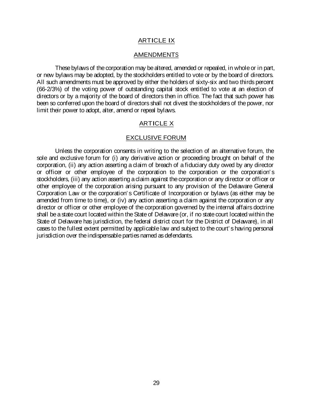 ARTICLE IX AMENDMENTS These bylaws of the corporation may be altered, amended or repealed, in whole or in part, or new bylaws may be adopted, by the stockholders entitled to vote or by the board of directors. All such amendments must be approved by either the holders of sixty-six and two thirds percent (66-2/3%) of the voting power of outstanding capital stock entitled to vote at an election of directors or by a majority of the board of directors then in office. The fact that such power has been so conferred upon the board of directors shall not divest the stockholders of the power, nor limit their power to adopt, alter, amend or repeal bylaws. ARTICLE X EXCLUSIVE FORUM Unless the corporation consents in writing to the selection of an alternative forum, the sole and exclusive forum for (i) any derivative action or proceeding brought on behalf of the corporation, (ii) any action asserting a claim of breach of a fiduciary duty owed by any director or officer or other employee of the corporation to the corporation or the corporation’s stockholders, (iii) any action asserting a claim against the corporation or any director or officer or other employee of the corporation arising pursuant to any provision of the Delaware General Corporation Law or the corporation’s Certificate of Incorporation or bylaws (as either may be amended from time to time), or (iv) any action asserting a claim against the corporation or any director or officer or other employee of the corporation governed by the internal affairs doctrine shall be a state court located within the State of Delaware (or, if no state court located within the State of Delaware has jurisdiction, the federal district court for the District of Delaware), in all cases to the fullest extent permitted by applicable law and subject to the court’s having personal jurisdiction over the indispensable parties named as defendants. 29