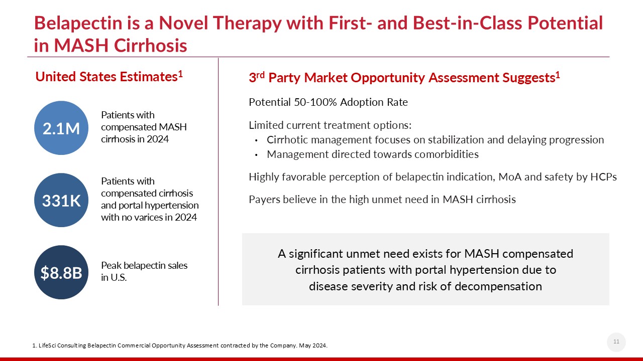 MASH Cirrhosis Represents a Significant Market Opportunity in the U.S. with No FDA-Approved Treatment  Metabolic dysfunction-associated steatohepatitis (MASH), previously known as non-alcoholic steatohepatitis (NASH), is characterized by fat accumulation, inflammation and fibrosis of the liver1  3%-5% of the global population is estimated to be affected by MASH, though the disease is considered to be underdiagnosed2  There are genetic predisposition to MASH, yet certain health conditions put patients at increased risk:3   1. Fatty Liver Foundation. https://www.fattyliverfoundation.org/#gsc.tab=0. .2. Sherif ZA, et al. Dig Dis Sci. 2016;61(5):1214-25. 3. NIDDK. NAFLD and MASH. https://www.niddk.nih.gov/health-information/liver-disease/nafld-nash/symptoms-causes. 4. Datamonitor Healthcare. MASH Disease Analysis. 5. Scientific Registry of Transplant Recipients. OPTN/SRTR 2021 Annual Data Report: Liver. https://srtr.transplant.hrsa.gov/annual_reports/2021/Liver.aspx. 6. Stepanova M, et al. Hepatol Commun. 2022;6(7):1506-1515.   5M   Progress to MASH cirrhosis1  20M   Develop liver fibrosis1  100M   Americans have fatty liver disease (most don’t know it)1  Only curative treatment is liver transplant1  30% of those listed for liver transplant will die waiting1  MASH cirrhosis is expected to become the most frequent reason for a liver transplant6  Prevalence increased >2x in the past decade 4  Addressable market in the U.S.  ~8.7K  Liver transplantations in the U.S.5   Being overweight or obese  Having hypertension, high cholesterol or high triglyceride levels  Having type 2 diabetes, insulin resistance or prediabetes  10