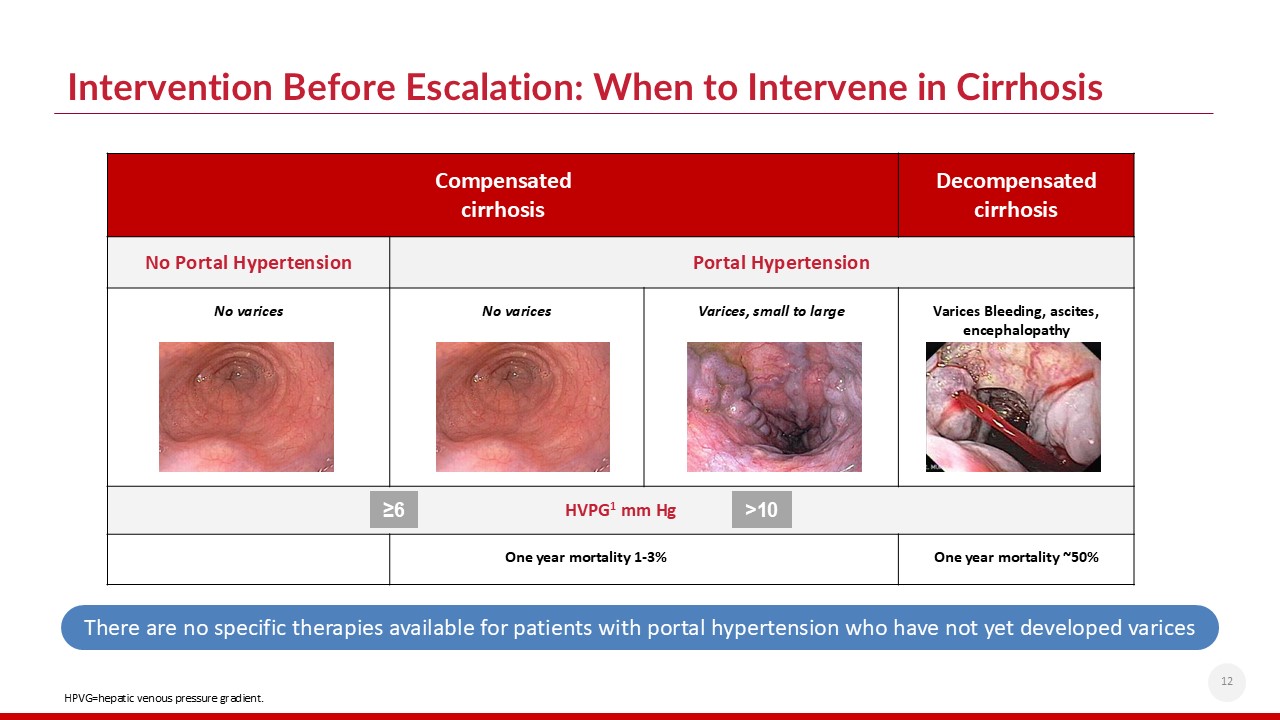 HPVG=hepatic venous pressure gradient.   There are no specific therapies available for patients with portal hypertension who have not yet developed varices  Intervention Before Escalation: When to Intervene in Cirrhosis  12  Compensated   cirrhosis  Decompensated cirrhosis  No Portal Hypertension   Portal Hypertension  Stage 2  Stage 3 and 4  No varices  No varices  Varices, small to large  Varices Bleeding, ascites, encephalopathy  HVPG1 mm Hg   One year mortality 1-3%  One year mortality ~50%  ≥6  >10