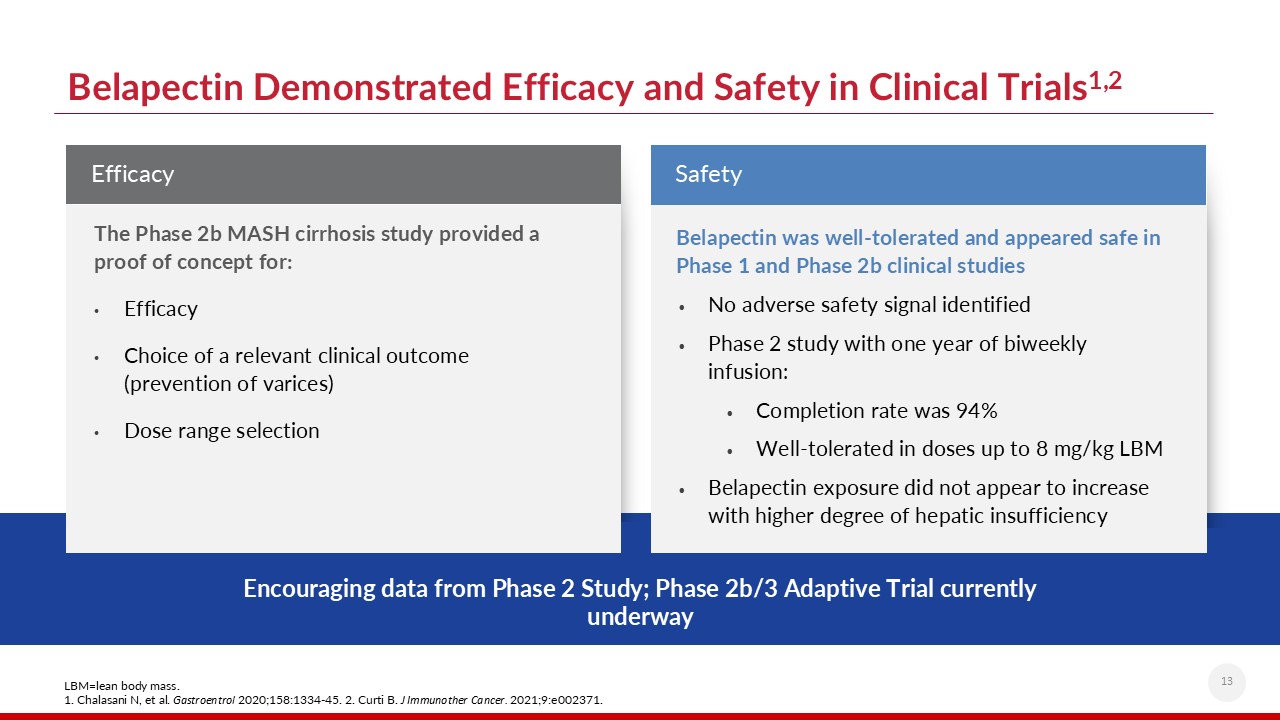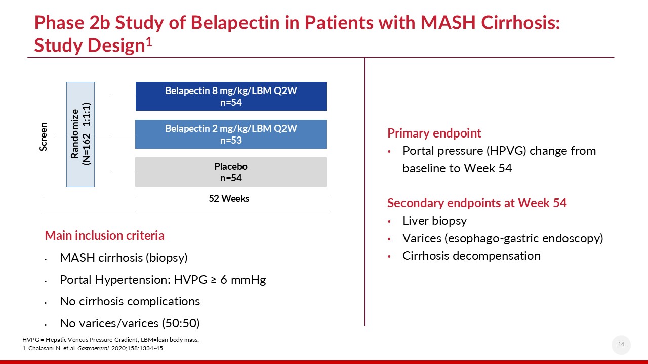 LBM=lean body mass.1. Chalasani N, et al. Gastroentrol 2020;158:1334-45. 2. Curti B. J Immunother Cancer. 2021;9:e002371.  Belapectin Demonstrated Efficacy and Safety in Clinical Trials1,2  13  Belapectin was well-tolerated and appeared safe in Phase 1 and Phase 2b clinical studies  No adverse safety signal identified  Phase 2 study with one year of biweekly infusion:  Completion rate was 94%  Well-tolerated in doses up to 8 mg/kg LBM  Belapectin exposure did not appear to increase with higher degree of hepatic insufficiency   Encouraging data from Phase 2 Study; Phase 2b/3 Adaptive Trial currently underway  The Phase 2b MASH cirrhosis study provided a proof of concept for:  Efficacy  Choice of a relevant clinical outcome (prevention of varices)  Dose range selection  Efficacy  Safety