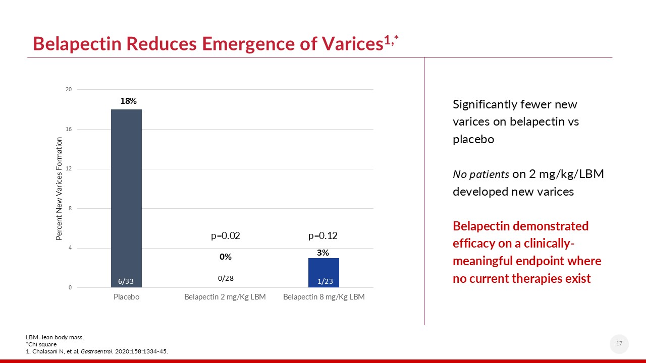 Belapectin Reduces Emergence of Varices1,*   17  Significantly fewer new varices on belapectin vs placebo  No patients on 2 mg/kg/LBM developed new varices  Belapectin demonstrated efficacy on a clinically-meaningful endpoint where no current therapies exist  LBM=lean body mass.  *Chi square  1. Chalasani N, et al. Gastroentrol. 2020;158:1334-45.  p=0.02  p=0.12
