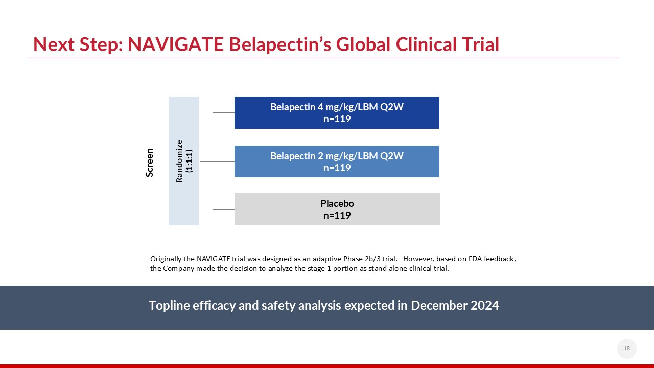 Belapectin is a novel, potent, galectin-3 inhibitor with Fast Track Designation  Low toxicity as a carbohydrate-based molecule which is degraded by natural processes   Patent protection through 2035  Only company to exclusively focus on treatment for the cirrhotic stage of MASH  Significant efficacy observed in cirrhotic patients without varices  Ongoing NAVIGATE global clinical trial; topline results expected in December 2024  Encouraging clinical response in difficult-to-treat cancers in combination with checkpoint inhibitor  IND filed and approval to proceed received from FDA (Head & Neck cancer)  Developing galectin-based therapeutics to improve the lives of patients with chronic liver diseases and cancer  $27M* cash and $6M remaining under line of credit provided by GALT Chairman*  Cash runway expected through May 2025  *As of September 30, 2024.  Focused Pipeline  MASH Cirrhosis  Oncology (Combination Therapy)  Finance  Investment Highlights  3