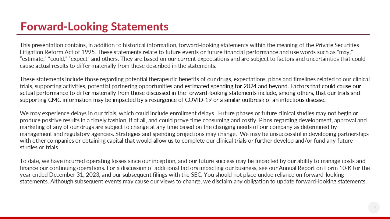 2  This presentation contains, in addition to historical information, forward-looking statements within the meaning of the Private Securities Litigation Reform Act of 1995. These statements relate to future events or future financial performance and use words such as “may,” “estimate,” “could,” “expect” and others. They are based on our current expectations and are subject to factors and uncertainties that could cause actual results to differ materially from those described in the statements.These statements include those regarding potential therapeutic benefits of our drugs, expectations, plans and timelines related to our clinical trials, supporting activities, potential partnering opportunities and estimated spending for 2024 and beyond. Factors that could cause our actual performance to differ materially from those discussed in the forward-looking statements include, among others, that our trials and supporting CMC information may be impacted by a resurgence of COVID-19 or a similar outbreak of an infectious disease.We may experience delays in our trials, which could include enrollment delays. Future phases or future clinical studies may not begin or produce positive results in a timely fashion, if at all, and could prove time consuming and costly. Plans regarding development, approval and marketing of any of our drugs are subject to change at any time based on the changing needs of our company as determined by management and regulatory agencies. Strategies and spending projections may change. We may be unsuccessful in developing partnerships with other companies or obtaining capital that would allow us to complete our clinical trials or further develop and/or fund any future studies or trials.To date, we have incurred operating losses since our inception, and our future success may be impacted by our ability to manage costs and finance our continuing operations. For a discussion of additional factors impacting our business, see our Annual Report on Form 10-K for the year ended December 31, 2023, and our subsequent filings with the SEC. You should not place undue reliance on forward-looking statements. Although subsequent events may cause our views to change, we disclaim any obligation to update forward-looking statements.  Forward-Looking Statements