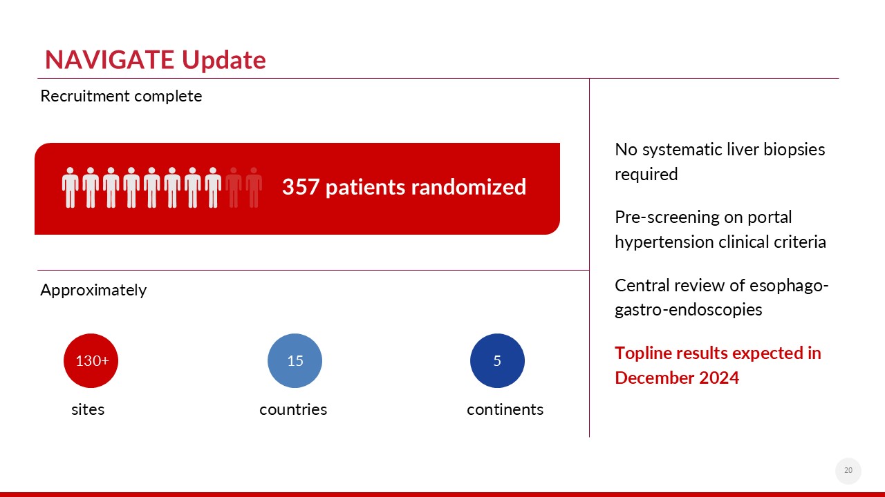 NAVIGATE Update  20  No systematic liver biopsies required  Pre-screening on portal hypertension clinical criteria  Central review of esophago-gastro-endoscopies  Topline results expected in December 2024  130+   15  5  sites   countries  continents  Approximately   Recruitment complete  357 patients randomized
