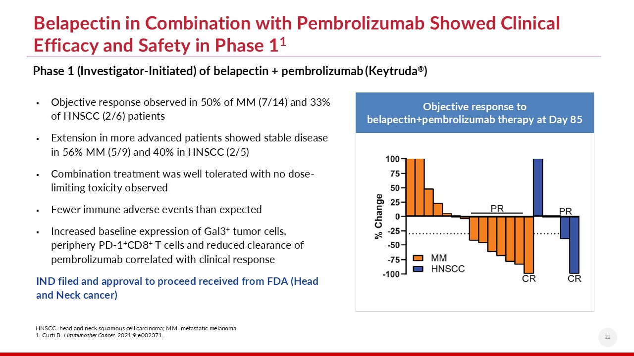 Phase 1 (Investigator-Initiated) of belapectin + pembrolizumab (Keytruda®)  Belapectin in Combination with Pembrolizumab Showed Clinical Efficacy and Safety in Phase 11  22  Objective response observed in 50% of MM (7/14) and 33% of HNSCC (2/6) patients   Extension in more advanced patients showed stable disease in 56% MM (5/9) and 40% in HNSCC (2/5)  Combination treatment was well tolerated with no dose-limiting toxicity observed  Fewer immune adverse events than expected  Increased baseline expression of Gal3+ tumor cells, periphery PD-1+CD8+ T cells and reduced clearance of pembrolizumab correlated with clinical response  IND filed and approval to proceed received from FDA (Head and Neck cancer)  HNSCC=head and neck squamous cell carcinoma; MM=metastatic melanoma.  1. Curti B. J Immunother Cancer. 2021;9:e002371.  Objective response to belapectin+pembrolizumab therapy at Day 85