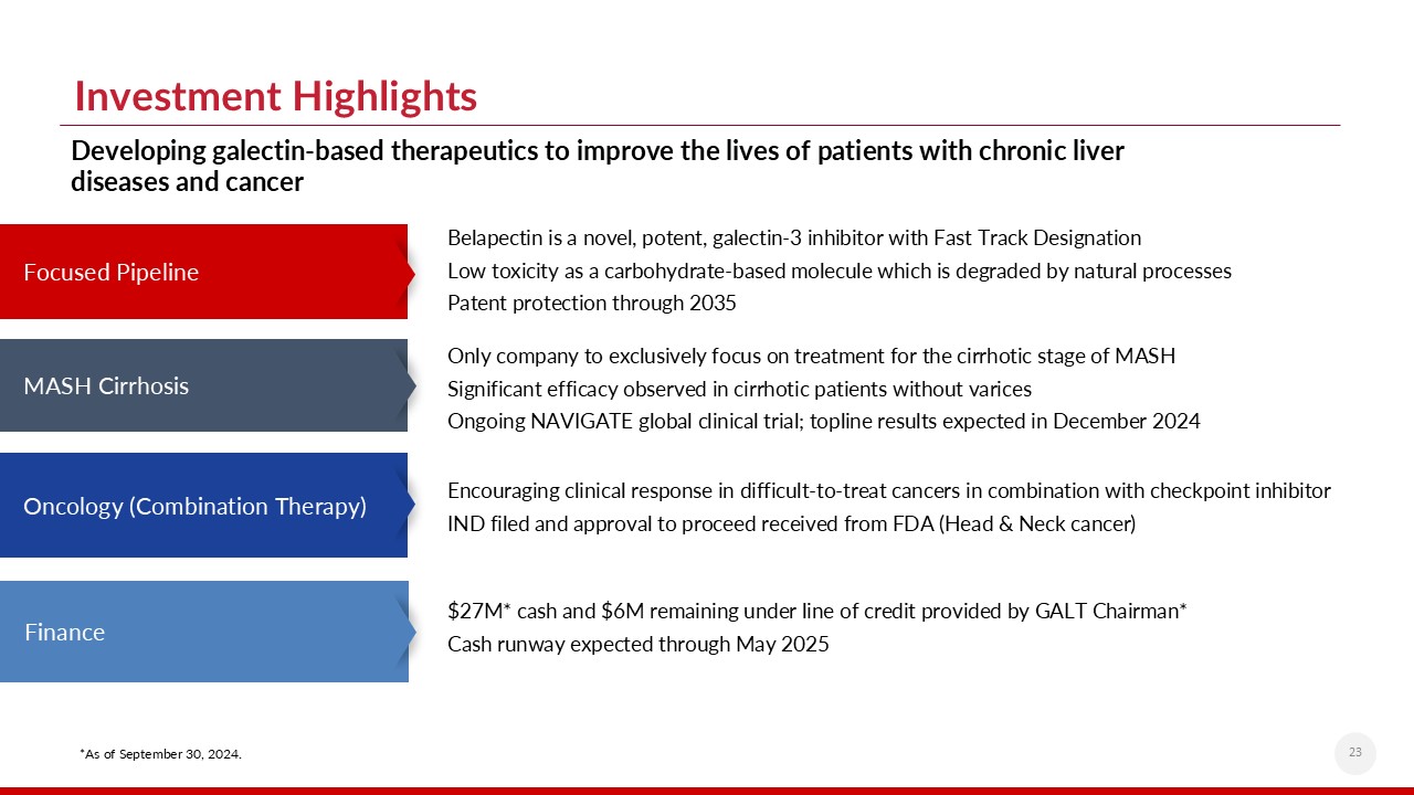 Belapectin is a novel, potent, galectin-3 inhibitor with Fast Track Designation  Low toxicity as a carbohydrate-based molecule which is degraded by natural processes   Patent protection through 2035  Only company to exclusively focus on treatment for the cirrhotic stage of MASH  Significant efficacy observed in cirrhotic patients without varices  Ongoing NAVIGATE global clinical trial; topline results expected in December 2024  Encouraging clinical response in difficult-to-treat cancers in combination with checkpoint inhibitor  IND filed and approval to proceed received from FDA (Head & Neck cancer)  Developing galectin-based therapeutics to improve the lives of patients with chronic liver diseases and cancer  $27M* cash and $6M remaining under line of credit provided by GALT Chairman*  Cash runway expected through May 2025  *As of September 30, 2024.  Focused Pipeline  MASH Cirrhosis  Oncology (Combination Therapy)  Finance  Investment Highlights  23