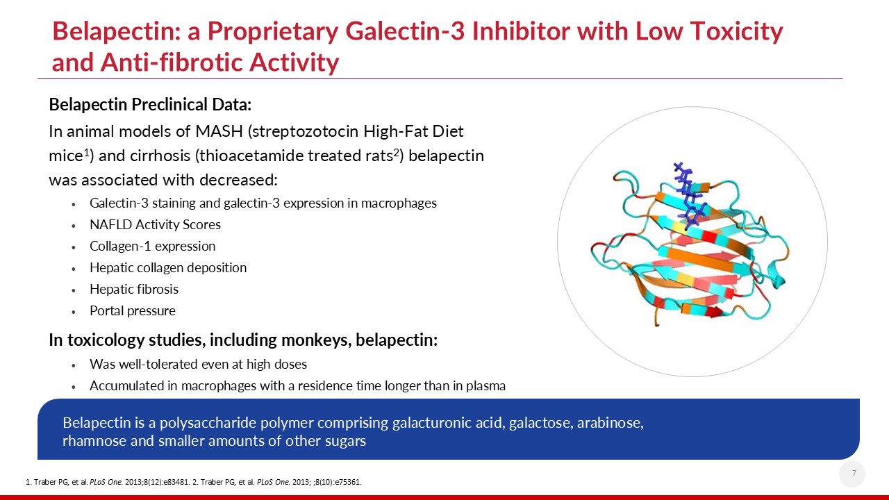 Belapectin: a Proprietary Galectin-3 Inhibitor with Low Toxicity and Anti-fibrotic Activity   Belapectin is a polysaccharide polymer comprising galacturonic acid, galactose, arabinose, rhamnose and smaller amounts of other sugars  Belapectin Preclinical Data:  In animal models of MASH (streptozotocin High-Fat Diet mice1) and cirrhosis (thioacetamide treated rats2) belapectin was associated with decreased:  Galectin-3 staining and galectin-3 expression in macrophages  NAFLD Activity Scores  Collagen-1 expression  Hepatic collagen deposition  Hepatic fibrosis   Portal pressure  In toxicology studies, including monkeys, belapectin:  Was well-tolerated even at high doses  Accumulated in macrophages with a residence time longer than in plasma  1. Traber PG, et al. PLoS One. 2013;8(12):e83481. 2. Traber PG, et al. PLoS One. 2013; ;8(10):e75361.  7
