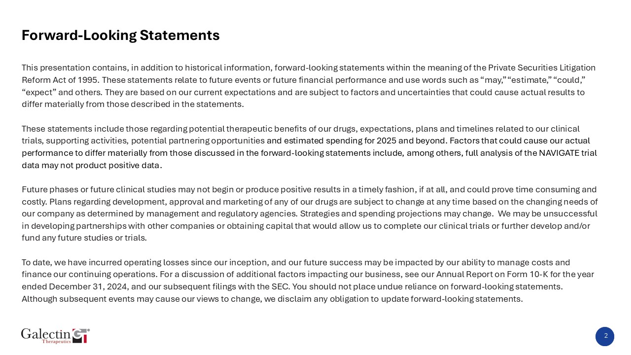 Forward-Looking Statements  This presentation contains, in addition to historical information, forward-looking statements within the meaning of the Private Securities Litigation Reform Act of 1995. These statements relate to future events or future financial performance and use words such as “may,” “estimate,” “could,” “expect” and others. They are based on our current expectations and are subject to factors and uncertainties that could cause actual results to differ materially from those described in the statements.These statements include those regarding potential therapeutic benefits of our drugs, expectations, plans and timelines related to our clinical trials, supporting activities, potential partnering opportunities and estimated spending for 2025 and beyond. Factors that could cause our actual performance to differ materially from those discussed in the forward-looking statements include, among others, full analysis of the NAVIGATE trial data may not product positive data.Future phases or future clinical studies may not begin or produce positive results in a timely fashion, if at all, and could prove time consuming and costly. Plans regarding development, approval and marketing of any of our drugs are subject to change at any time based on the changing needs of our company as determined by management and regulatory agencies. Strategies and spending projections may change. We may be unsuccessful in developing partnerships with other companies or obtaining capital that would allow us to complete our clinical trials or further develop and/or fund any future studies or trials.To date, we have incurred operating losses since our inception, and our future success may be impacted by our ability to manage costs and finance our continuing operations. For a discussion of additional factors impacting our business, see our Annual Report on Form 10-K for the year ended December 31, 2024, and our subsequent filings with the SEC. You should not place undue reliance on forward-looking statements. Although subsequent events may cause our views to change, we disclaim any obligation to update forward-looking statements.  2