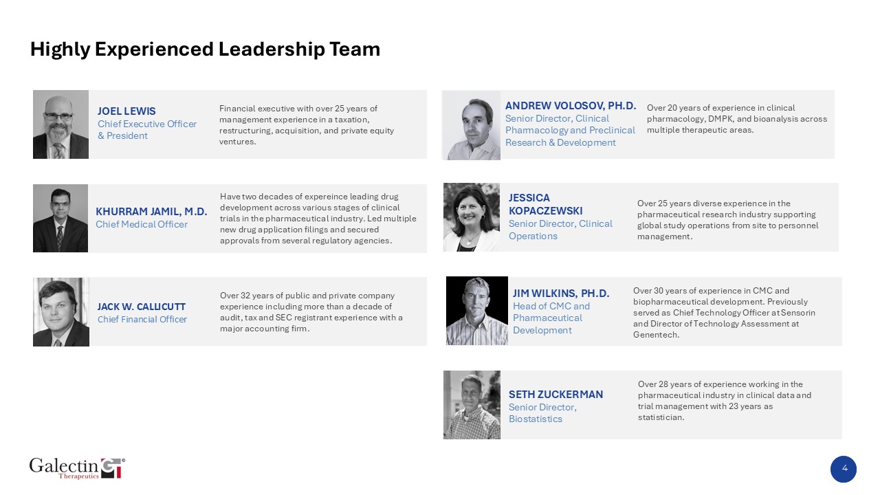 Belapectin is a novel, potent, galectin-3 inhibitor with Fast Track Designation  Low toxicity as a carbohydrate-based molecule which is degraded by natural processes   Patent protection through 2032  Only company to exclusively focus on treatment for MASH cirrhosis and portal hypertension  Significant efficacy observed in cirrhotic patients without varices  Promising NAVIGATE results at 18 month read out, ≥40% reduction in new varices vs placebo in ITT; significantly lower incidence of new varices in per protocol population  Encouraging clinical response in difficult-to-treat cancers in combination with checkpoint inhibitor  IND filed and approval to proceed received from FDA (Head & Neck cancer)  Developing galectin-based therapeutics to improve the lives of patients with chronic liver diseases and cancer  Focused Pipeline  MASH Cirrhosis  Oncology (Combination Therapy)  3  Investment Highlights